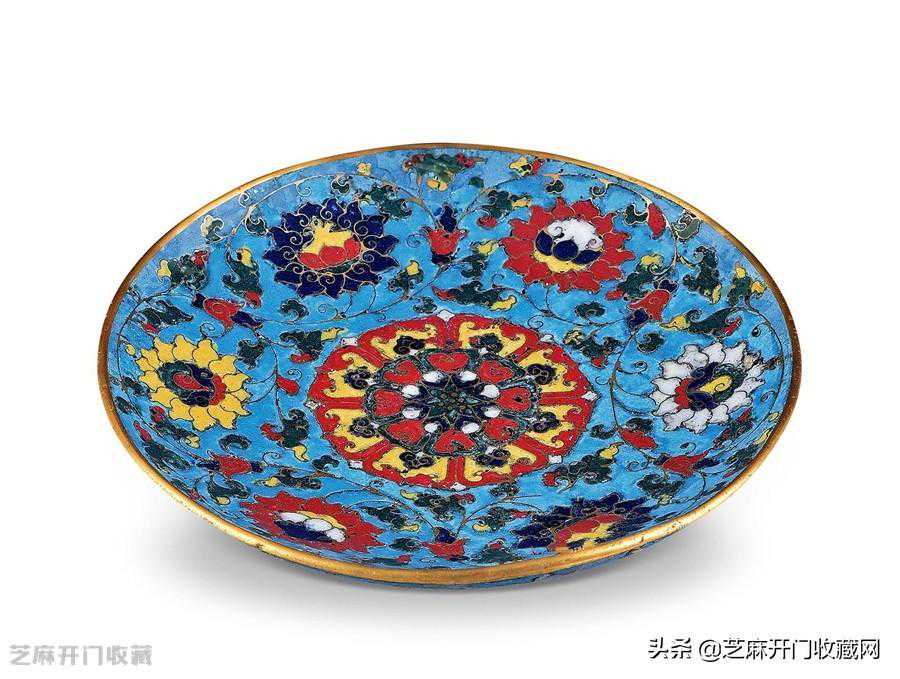 4:明宣德铜胎掐丝珐琅宝相花纹供盘,尺寸:直径13.5厘米,估价:HKD200万-300万,成交价:HKD236万