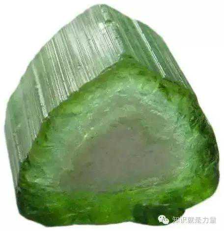 碧玺断面叫球面三角形,从横截面看断口能看到晶体侧面,面上明显条纹纵纹生长方向一致,断面上看是三角形,每个三角形直边都变成曲线,曲线外弧往外凸出来,这个叫球面三角形。碧玺晶面有平行纵纹,但横截面是球面三角形,这两点是天然碧玺主要晶体鉴定特征。
