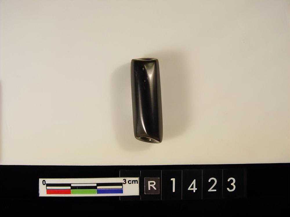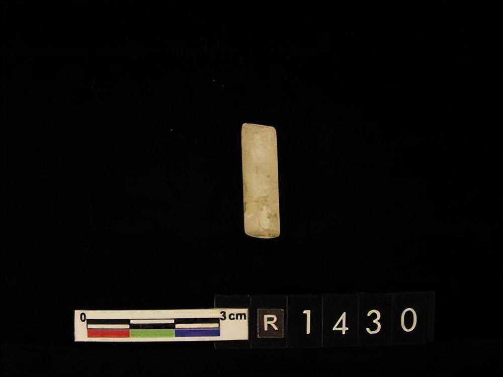 灰色长方形小石斧,两端均向内协中间有一原穿孔,表面经搓平,部份剥蚀失原来石皮,一面平齐,另一面则向刃部逐渐减少,刃部完整,偏锋。