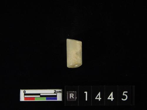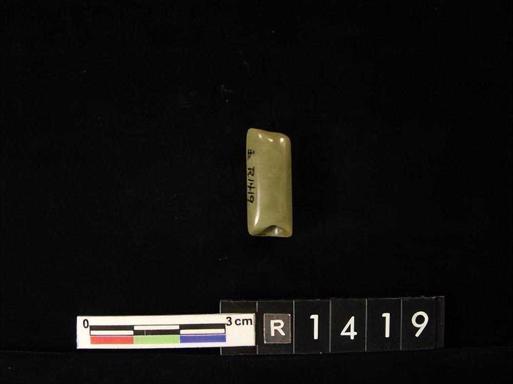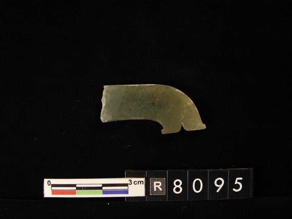 半圆形,一端残缺,一端有一小缺口,质极硬,色青绿
