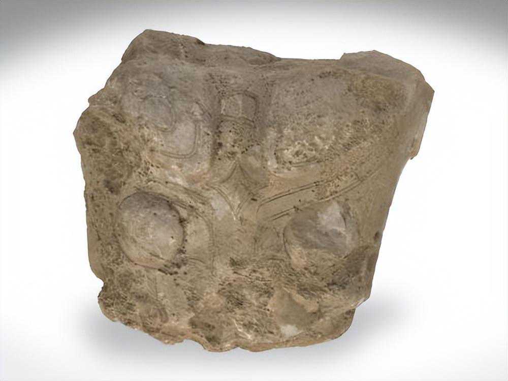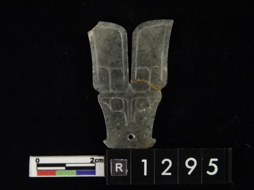 为一面平面,石片上浮出一兽头,兽之两角高耸,下为两眼,石片上下有穿孔,并有涂珠之刻文,惜残缺,不知其全形,色黄。