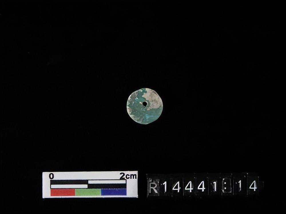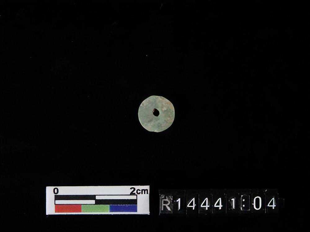 色灰白,杂绿斑,形式同1550-40墓里出的玉凸边璧(R00912)。