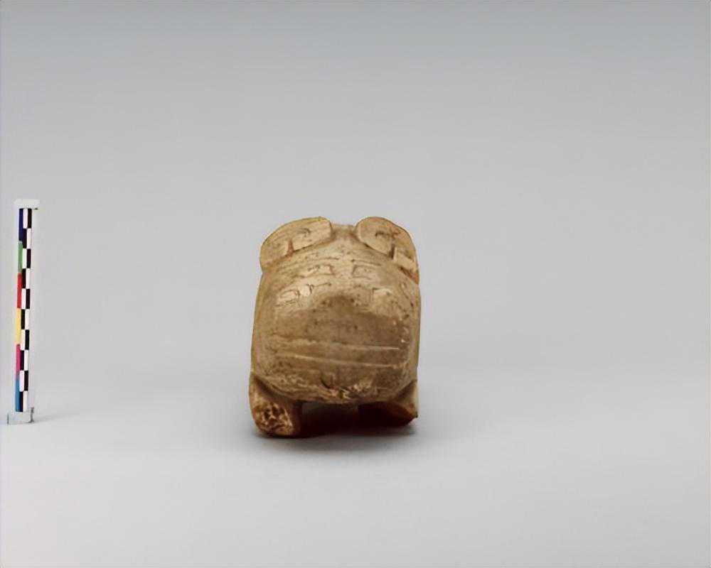 色灰白,虎形立雕,头部特大,口为一横长条,刻纹甚浅,上为弯鼻,其后为臣形眼,眼背之间耸立两耳,中有一缺口,背部凹下不平,腹下为一长形足,亦不平整,腹后部为一长尾。尾尖略翘起。