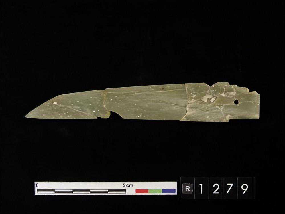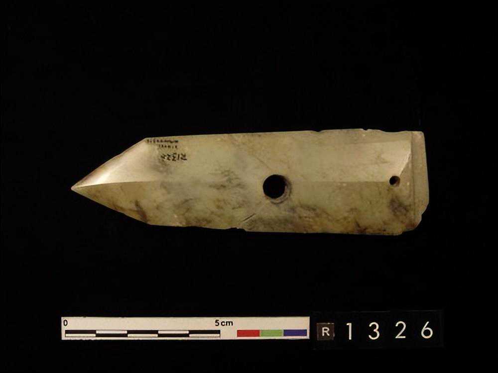 刃尖三角形,中有脊直达近柄处,中有一圆孔,无内,色青灰。