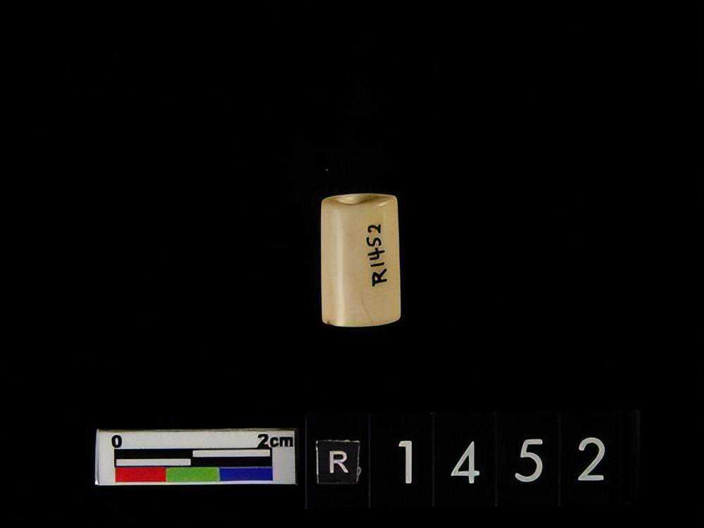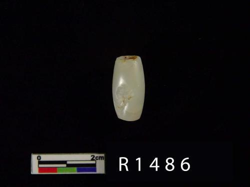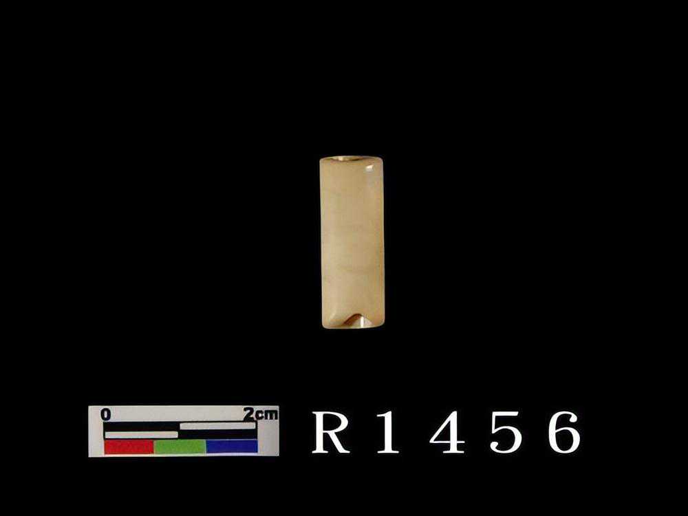 器为弧状,两端有孔,外面刻有带目文之纹饰两组,色白,微有斑。