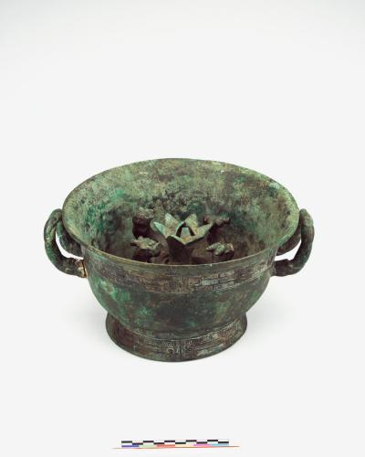 腹内正中有一圆柱,顶为六角花瓣形,中空下实,柱中部有四翘首蟠龙环绕二组,一为牛角一为茸形角,可以旋转,不明其用。外颈饰目雷纹,填以雷纹,两旁有耳为纽索形,其与腹接銲处作兽头形,另一耳似原来脱落又经接銲者,足部饰兽面一圈,凡三组。圈足有三十字孔。