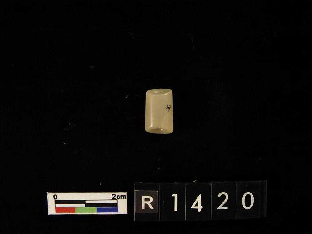 此器方柱状内呈圆筒形,柱中有凸起弦文四道,上下有花文,均阳纹,筒上亦有弦文一道。→色黄白。土中浸蚀过久,石质鬆坏甚多,如海棉。