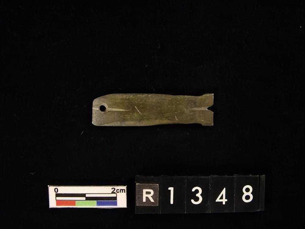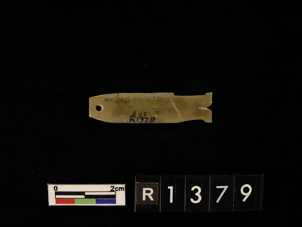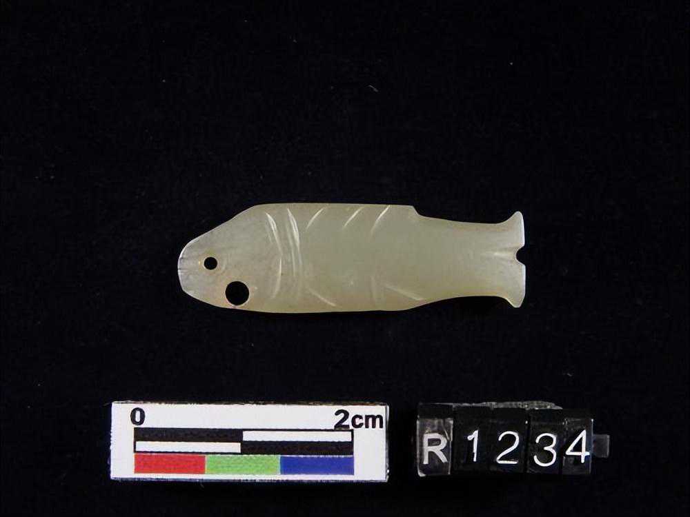 1443墓。。。玉鱼璜,目為一小孔,背腹鰭均為細小之刻文,尾薄如刀刃。。。