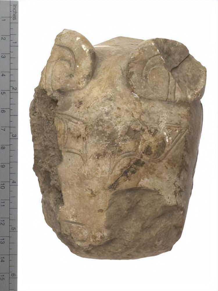 立体雕刻,上宽厚,下窄而稍薄,近梯形,头面具高浮雕之眼鼻角及耳,口大张如长方形槽,无齿,臣形眼,眼珠凸出,上为阴绞钩眉,再上为心形角,两侧有耳,下有阴线纹饰,右耳残缺,头顶似为一甚宽之槽,底平,多处风化剥蚀,鼻残缺,似为凹形,色灰黄。