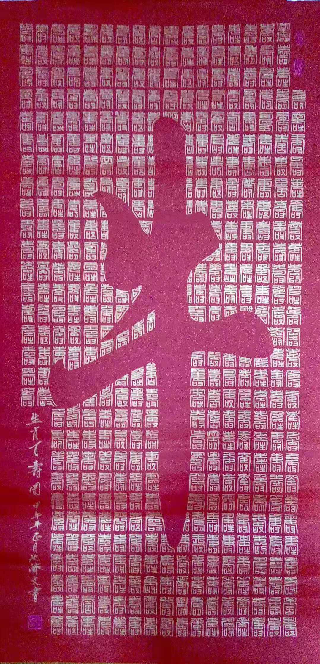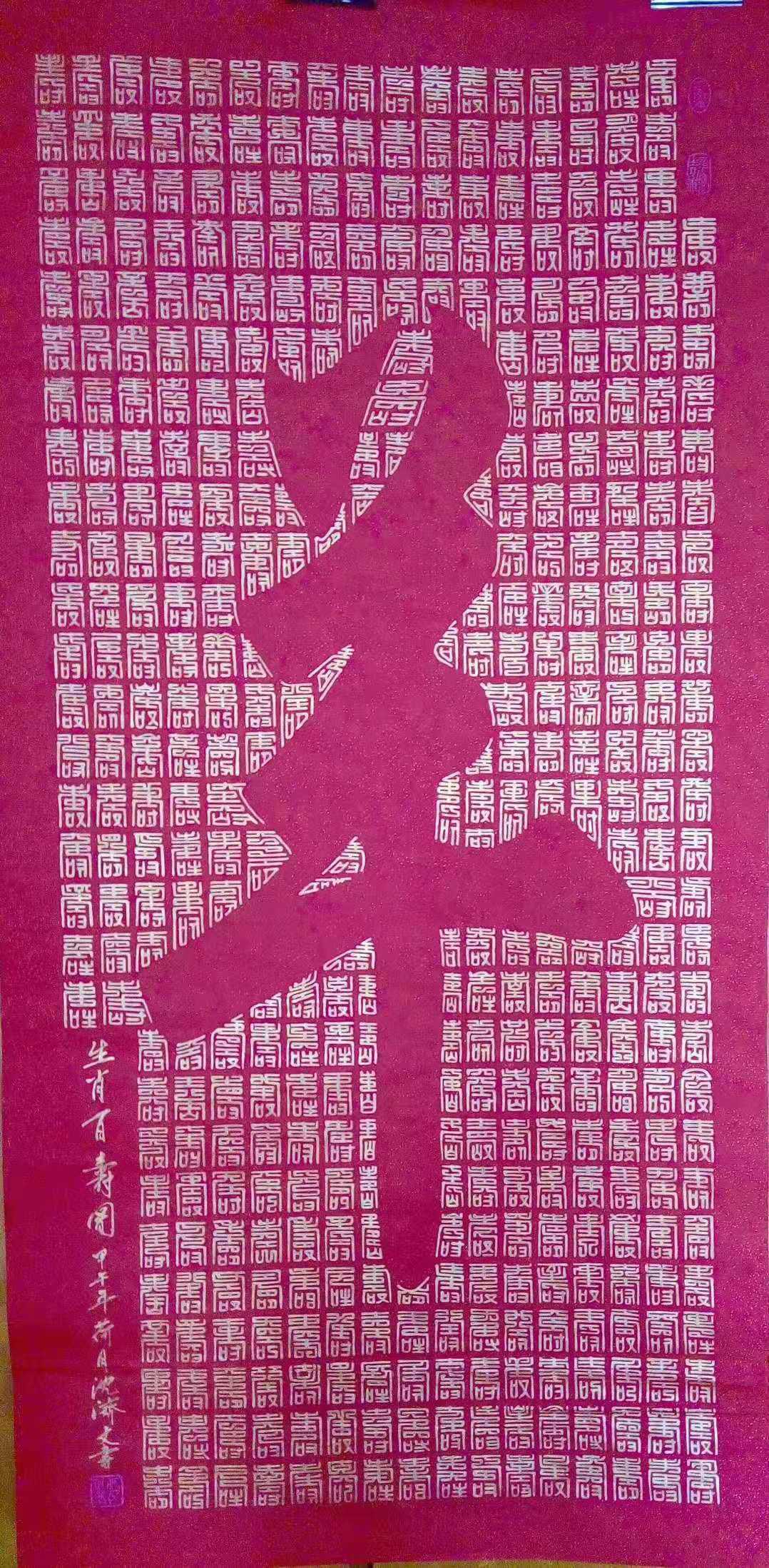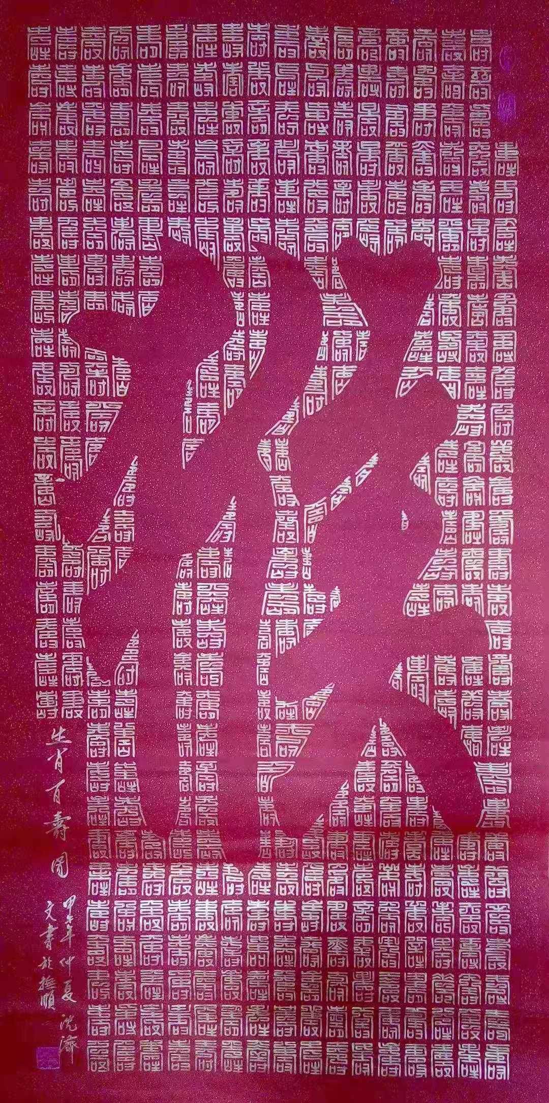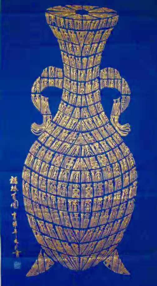 沈济文目前“合璧书”书法主要有三大系列:人物系列主要为名人肖像与篆书百字镶嵌成作品;花瓶系列:花瓶寓意平平安安之意,用花瓶与篆书百字镶嵌在一起形成完整的平安百字图。组图系列:是用不同写法的篆书寿、福、禄、喜、财等字组成大字,形成百寿图、百福图、百禄图、百喜图等。