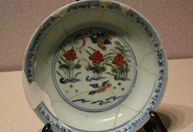 明宣德青花五彩鸳鸯莲池纹盘(残件)