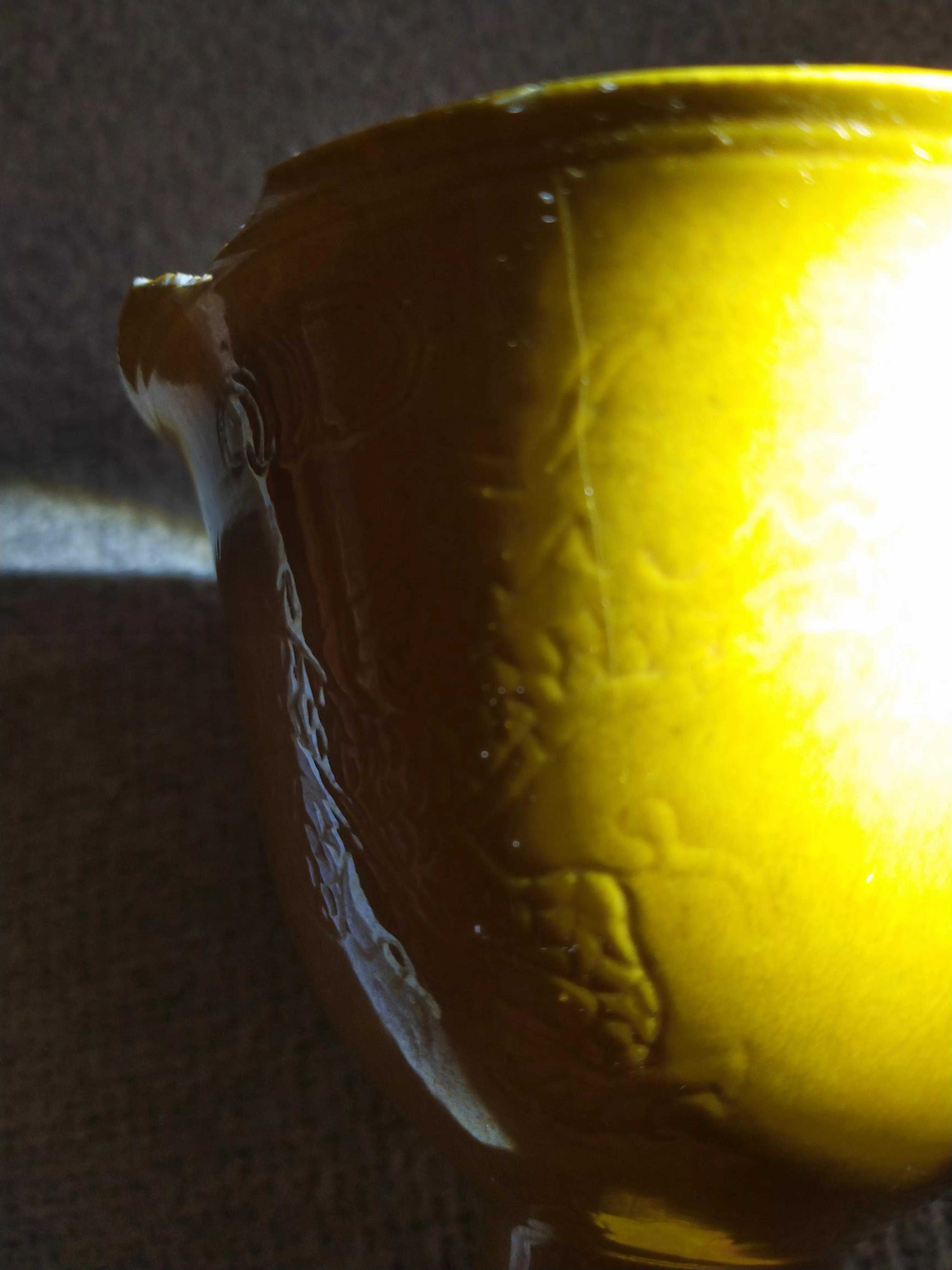 简介有时候残器也是一种欣赏学习,尤其,皇家用品难得一见。偶得嘉靖黄釉杯,杯外壁暗刻五爪龙纹,暗刻“内府”二字,杯柄暗刻芭蕉纹饰。薄胎黄釉,呈半透明。底款书写规整,白釉亮白。口沿三处残缺,有点可惜,其他完好。用手电观察呈半脱胎透明状,器壁暗刻龙纹,五爪青花款书写规整,亮白釉润泽“内府”二字难得所见,下面微...