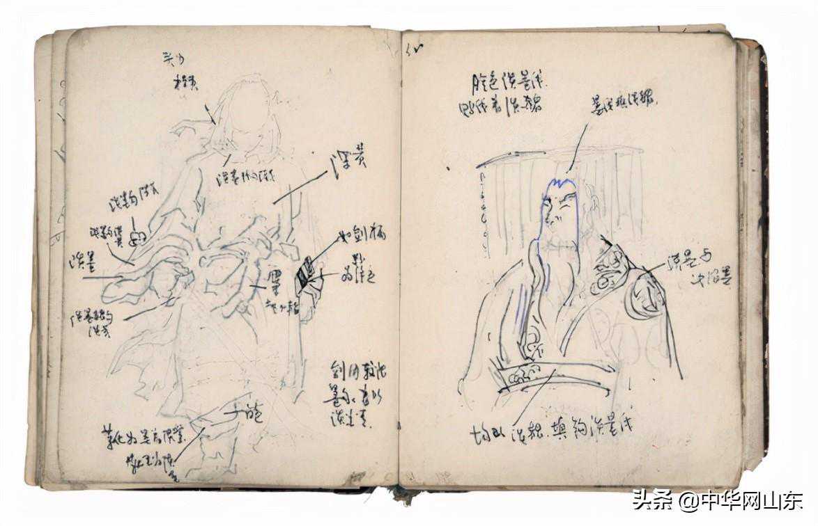 这件有意思,是关于“批林批孔”的,当时画这个是为了回来搞批判,画板报、画墙报。“批林批孔”是1974年,当时领导让我们去画秦始皇,画上还标着填色方法,如头顶用橘黄色,脸是淡墨线,墨线添淡赭。领导让我们画完之后去参加一个展览。那时候我们进城宣传,回来把看到的再画出来,没有照相机怎么办?我就去写生,写生回来再画在单位的板报上。