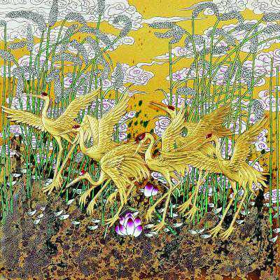 配色灵感:白鸟穿梭于黄花丛,与青底交相辉映,自然灵动,华贵典雅。