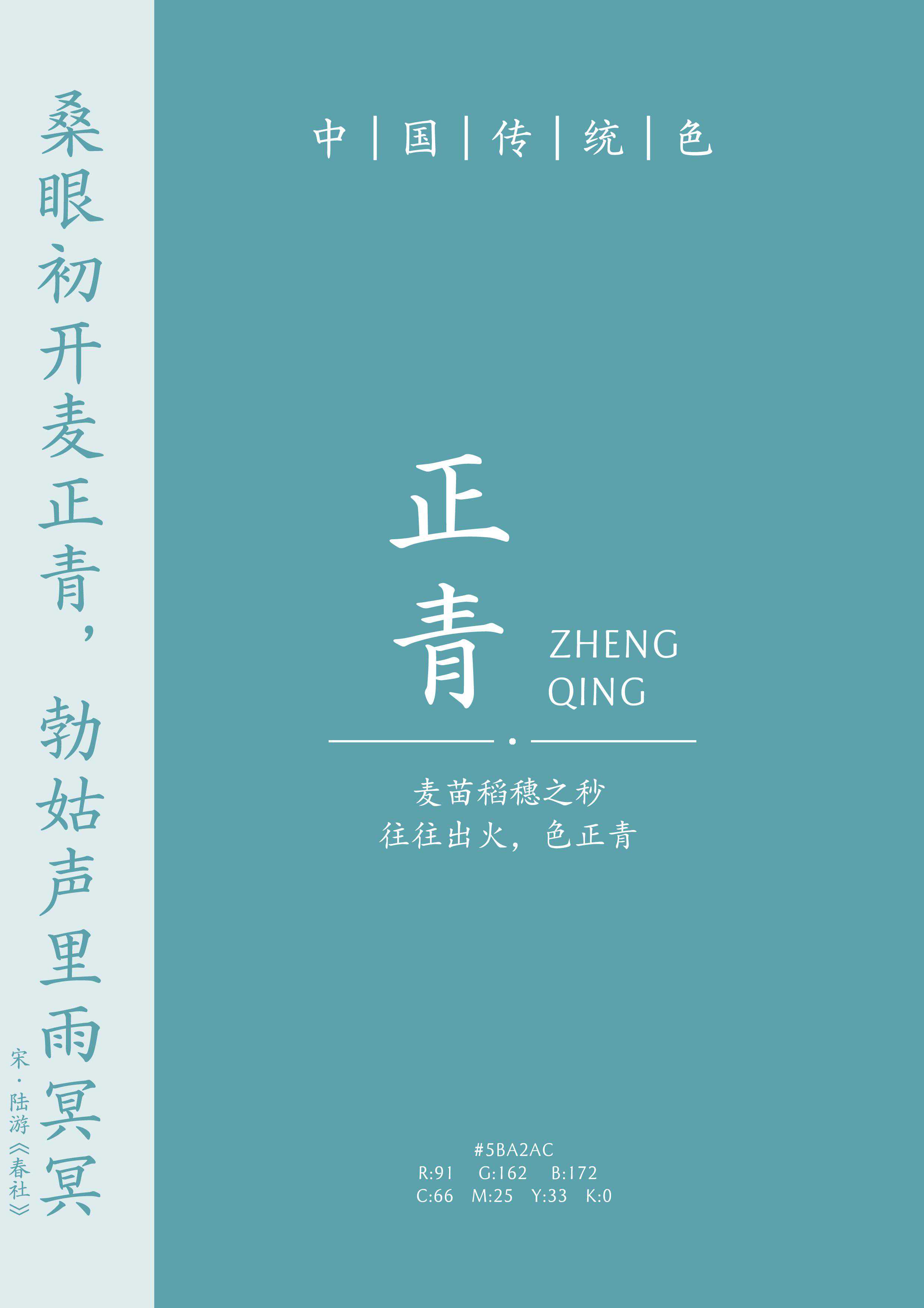 “桑眼初开麦正青,勃姑声里雨冥冥。”(宋·陆游《春社》)正青,即纯青。陆游《老学庵笔记》卷四中的“麦苗稻穗之秒,往往出火,色正青”就是形容此色。