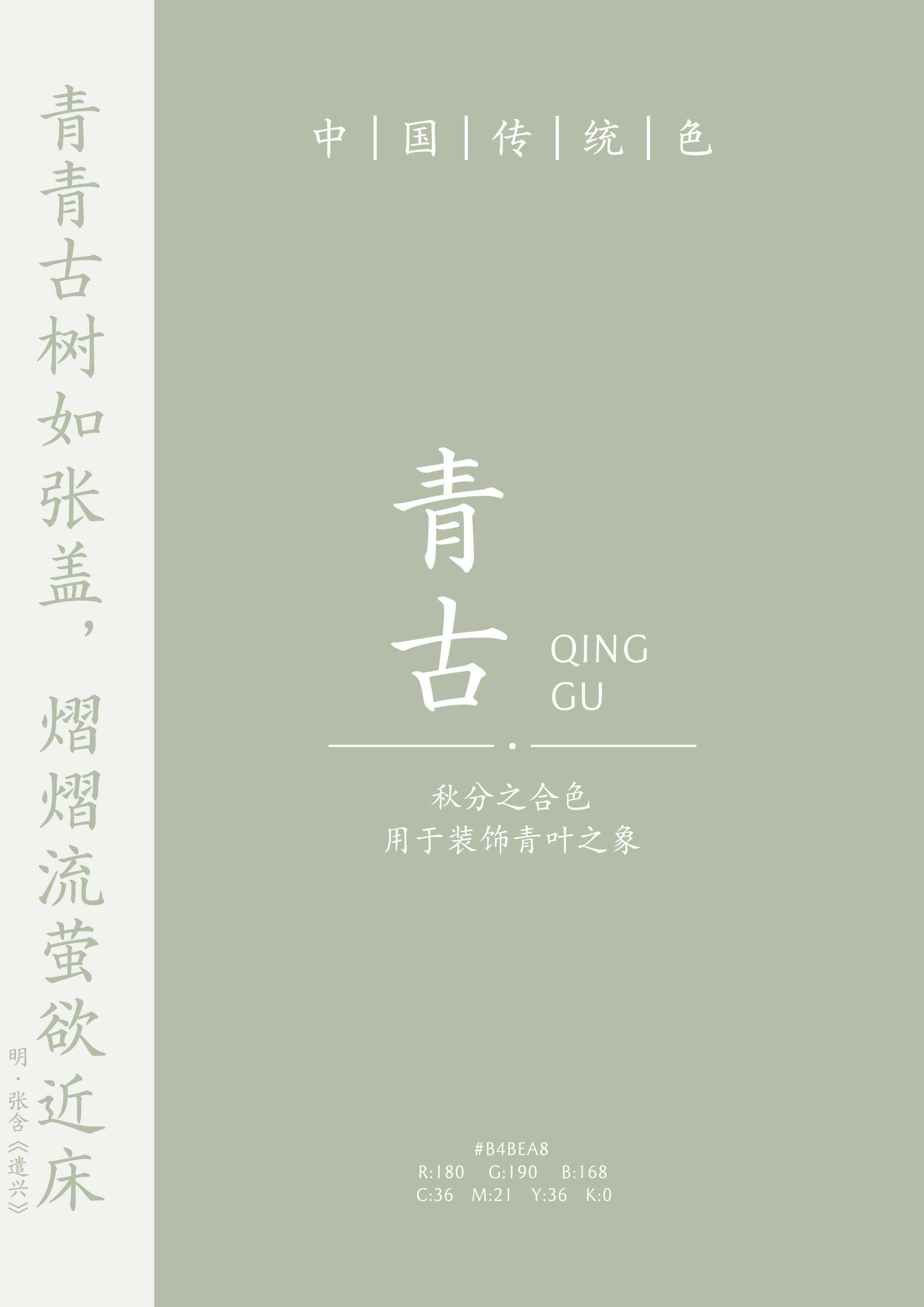 “青青古树如张盖,熠熠流萤欲近床。”(明·张含《遣兴》)青古,秋分之合色,从佛山金箔相关著作里考证的颜色,用于装饰青叶之象。彩色青金即青古,主要用于木雕树叶的漆贴,表现树叶的青色。