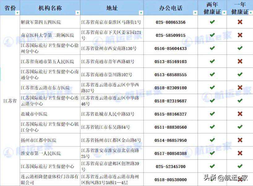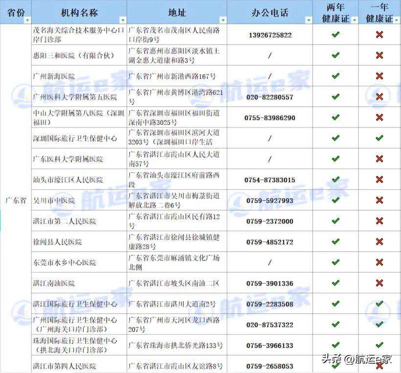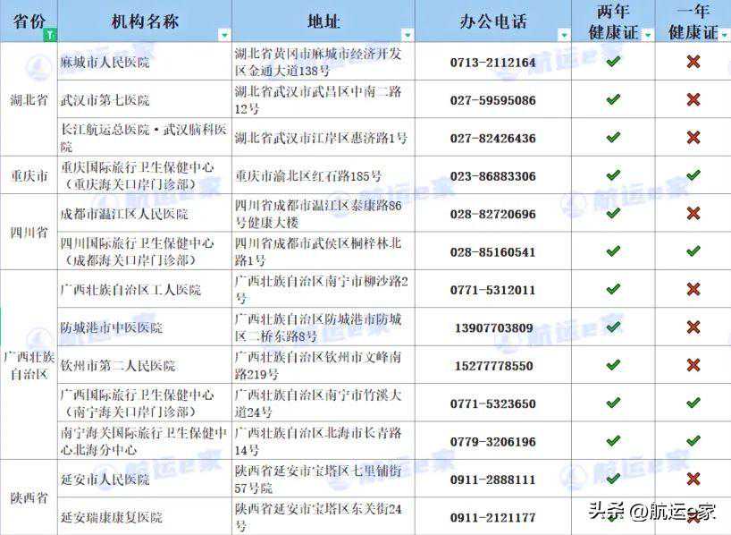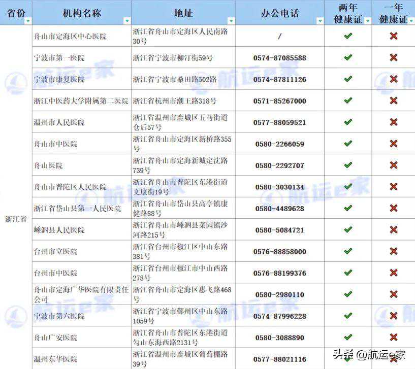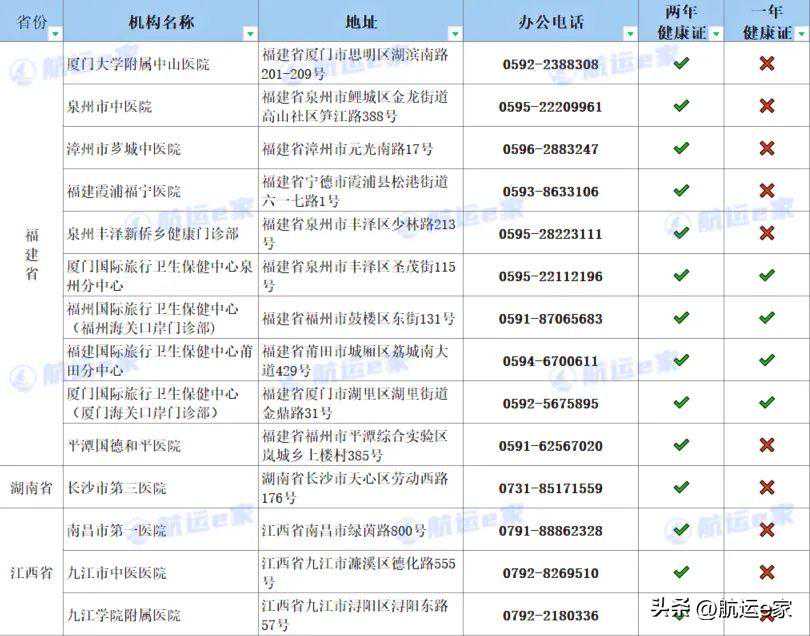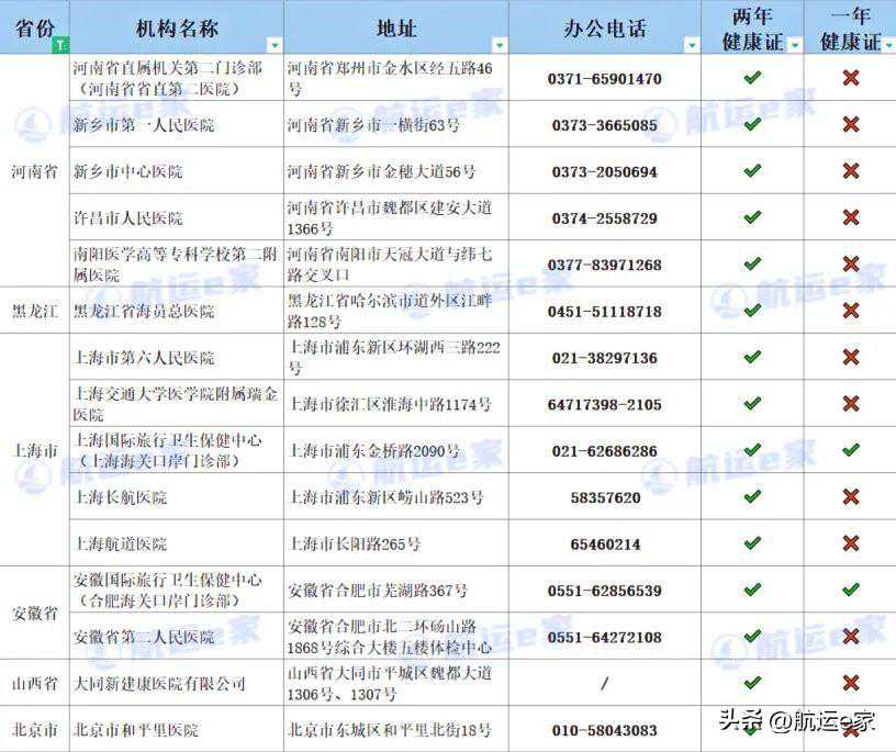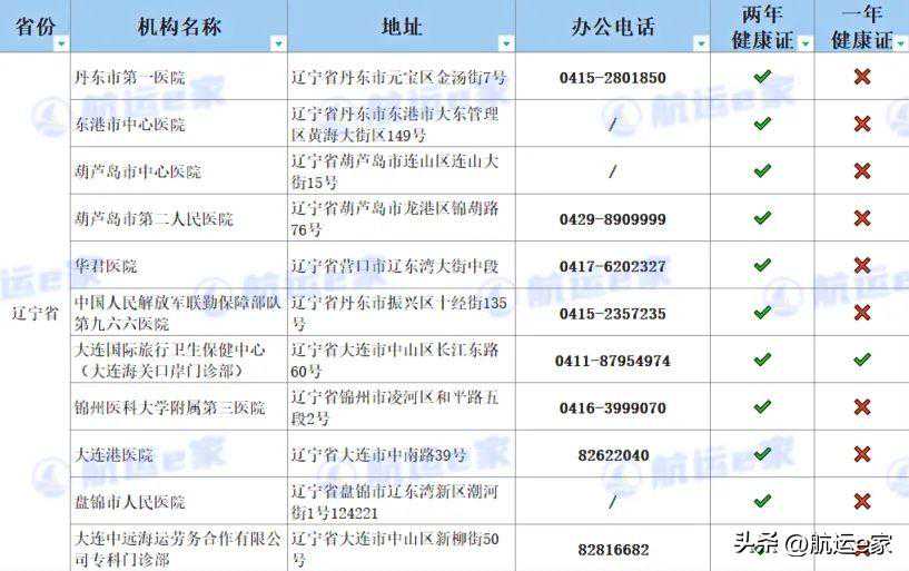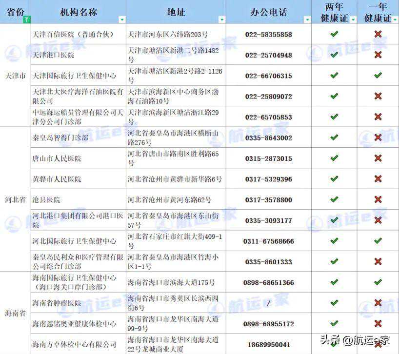 简介无论是跑国内航线或者国际航线,船员都必须持有船员健康证。但不是随便一所医院都有办理船员健康证的资质哦!除了去海事局官网查询有海员体检资质的医院外,航运e家还帮大家整理了最新《全国海员体检机构最新版》供大家查询。已标明一检两证机构~欢迎各位船员兄弟转发收藏!01上航运e家APP在线查询手机点一点就知道...