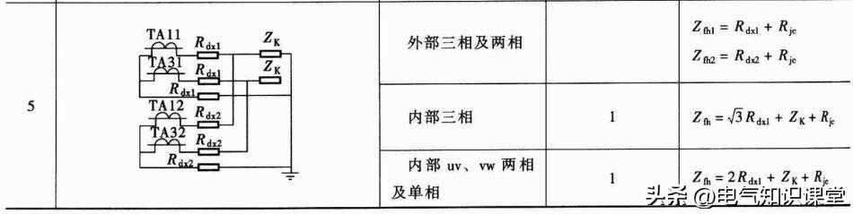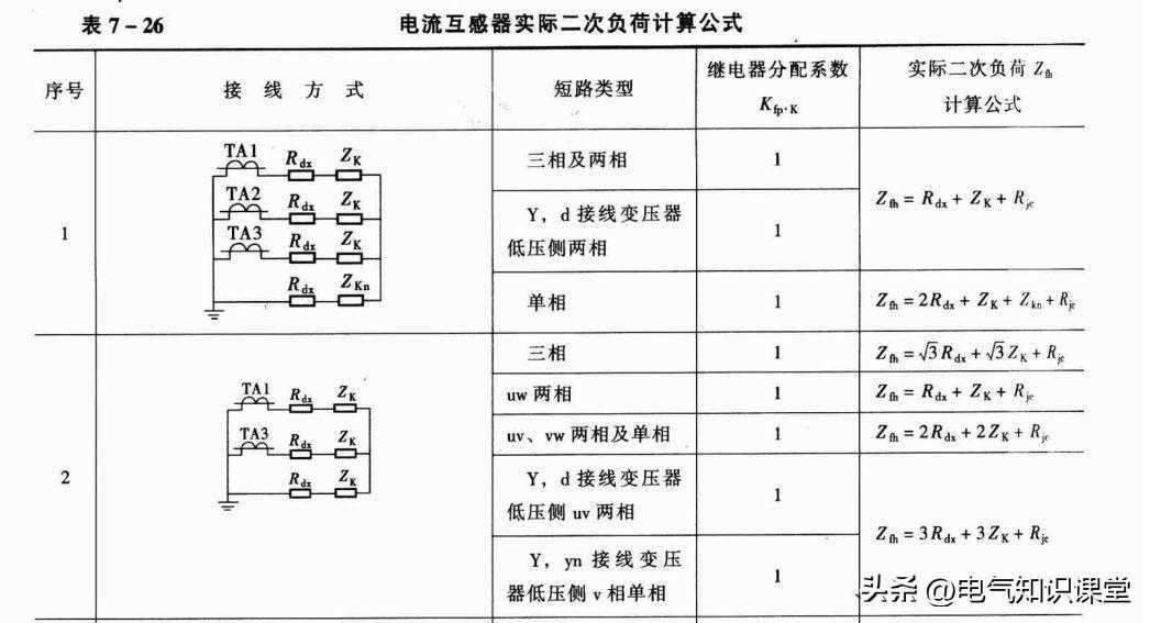 电流互感器校验方法三:根据对电流互感器二次负荷最严重的短路类型,计算出电流互感器的实际二次负荷。这个步骤涉及到复杂的计算,需要使用特定的公式和表格,如下表所示: