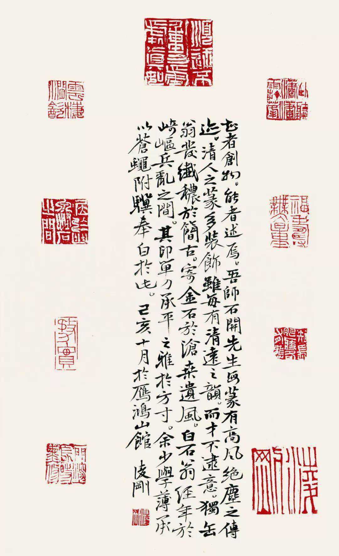 知者创物,能者述焉。吾师石开先生每篆有高风絶尘之传蹟。清人之篆多装饰,虽每有清远之韵而才不逮意,独缶翁发纤穠扵简古,寄金石于沧桑遗风,白石翁经秊于崎岖兵乱之间,其印单刀承平之雅扵方寸。余少学薄承以苍蝇附骥奉白于此。