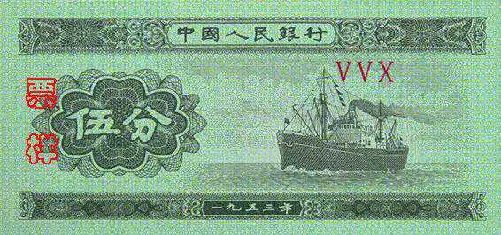 正面为水电站图,背面胶印图案为国徽及“中国人民银行伍角”字样。
