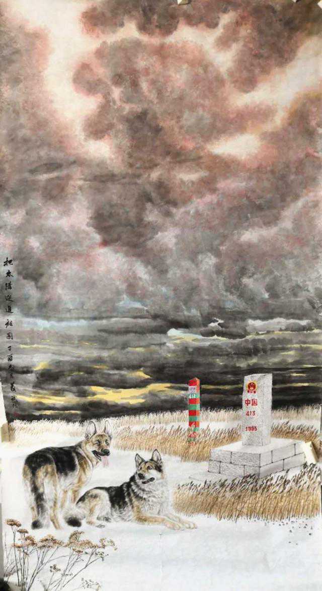 这幅充满革命乐观主义精神的画作,构图精紧,主题鲜明,笔墨豪迈,富于变化,在激情洋溢中,淋漓尽致地刻画出那种身为祖国军人的自信自豪、那种戍边保国的无私无畏、那种情寄白山黑水的执著忠贞。