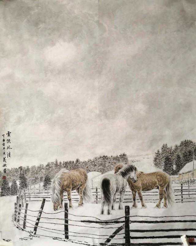 丁酉年秋天,聂义斌画了一幅题为《新雪》的画,还是熟悉的白山黑水,还是熟悉的北疆生活。