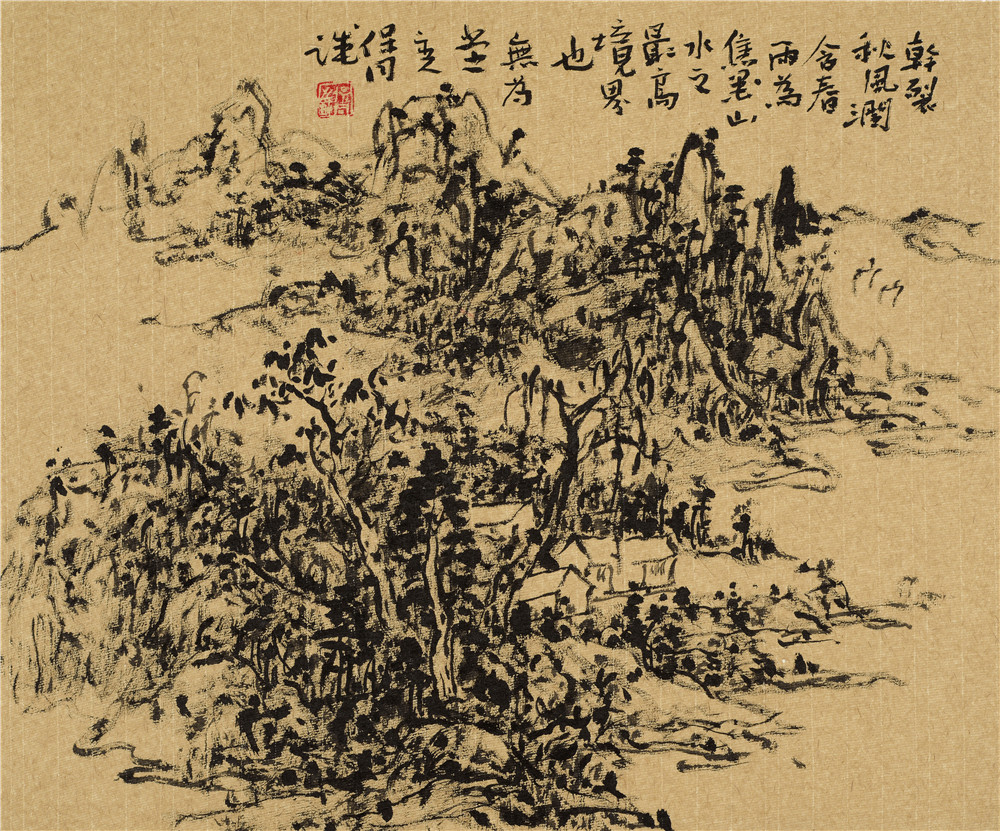 髡残的画,笔墨高古苍莽,绝无世俗气,用笔苍劲老辣,气势夺人如龙行空、虎踞岩,无任何功利之心,真正达到了“点画无奇但率真”。他的画无论是浓焦墨还是淡干墨,无论是实实在在的长线,还是时断时续,虚虚掩掩的渴笔短线,无论是屋舍人物的勾勒,还是提醒收拾的点苔,甚至皴擦勾染中都是踏实的中锋用笔,他的线内敛含蓄,柔中带刚,重提按,讲节奏,很慢、很毛、很厚、很拙、很圆,充满了坚实厚重,生辣幽雅,斑驳,宁静而又空灵的金石味道,有移山扛鼎之力。这一方面得力于他师造化常住在南京牛首山一带写生的地貌有关,另一方面源于他长期的参禅悟道和对书法金石篆刻的研究和领悟。