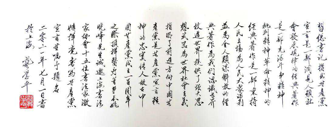 能够加入《共产党宣言》书法卷的创作团队,共同创作这样一件具有划时代意义的作品,深感荣幸。我的创作是用自己最擅长的行书,力求清雅、朴实、流畅,一气呵成。