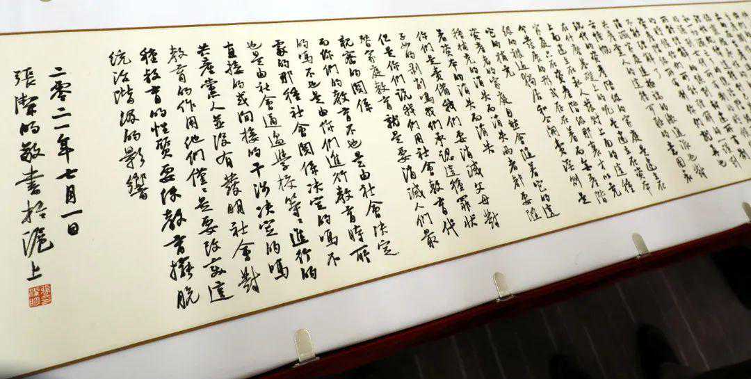 《共产党宣言》共有一万五千字左右。十五位书法家每人写一千字,裱成长卷后有57米长,且书体基本统一,每字在二、三公分,以小行草书写。从艺术角度讲,整体的书风以王羲之、王献之二王体系为主,有的偏行草,有的偏行楷。书法家中五位是现任上海书法家协会主席团成员,多位是区书法家协会主席,还有的是大学教授。