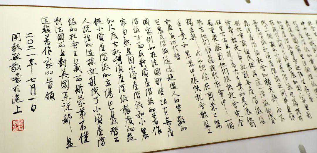 作为一名书法家,共产党员,金山人,能够成为《共产党宣言》书法卷书写者之一,感到很激动、很荣幸。这次我采用的是行书风格,共计1000字左右,前后用了6个小时。