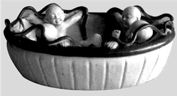 第一种作品从性别的角度来看,有男孩也有女孩;从民族来看,不仅仅塑造汉族孩童,也有其他民族的孩童;从孩童的姿态来看,有些孩童是站立的,身体前倾,弯腰弓背,双手抚膝,有些孩童盘腿而坐,双手放于大腿之上,还有孩童两腿叉开坐于石墩上,目光向前,双手合十;从孩童的动作上来看,有抱着宠物如猫狗之类,有抱着挂果的,还有击鼓的、抱盒的多种动作。孩童中不仅有普通人家的孩子,还有身着羽毛编成的道服、手中持净瓶的道童形象。瓷塑孩童身上的服饰也不尽相同,有身穿窄袖长袍的,有着圆领窄袖的,还有一些孩子颈部带有项圈。这些不同性别、民族、姿态、动作、服饰的孩童瓷塑,让我们全面感受到了那个时代儿童的活泼可爱。在一件元代枢密府的釉瓷洗上(图十一),塑造着四个孩童的形象,该洗为正椭圆形,澡盆状,内塑四个洗澡的儿童,儿童均展开双臂用手抓住池沿。人物塑造真实细腻,开脸稚气,四肢及脚趾的刻划都十分精细到位,洗底部及内壁共塑四张荷叶,又环绕每个儿童头顶处塑出四条藤茎供儿童抓握。这件瓷塑中,将四个孩童的形象自然地放于一个洗中,构思不可谓不妙,而做工又相当的细腻,是瓷塑作品中的精品。