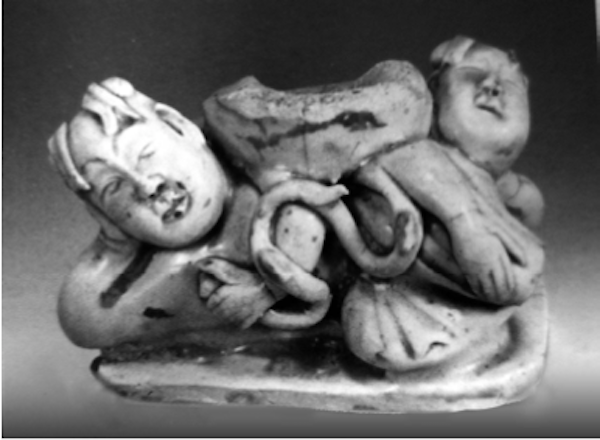 宋元时期的孩儿枕中最著名的一个是收藏于故宫博物院的定窑白瓷孩儿枕(图十二),该枕造型以小孩背部作为枕面,婴儿侧卧于榻上,孩童眉清目秀,体态圆润,双目微开,小手放于头之下做欲睡状,两脚弯曲交叠,状态悠闲,形象非常生动。而枕的做工上,从花纹到衣饰都精雕细刻,逼真流畅,显示出杰出的制瓷与雕刻工艺,是宋代艺术宝库中不可多得的珍品。而孩儿枕上孩童的数量,不仅有一个的,并且会有一个孩儿枕上塑有两个孩童的形象,如湖田窑发现的一件孩儿枕作品(图十三),枕体塑成两个手持莲枝的孩童背向交体侧卧于扁平长方形垫板上。左侧婴孩右手支头,左手抱莲枝;右侧婴孩左手支头,右手抱另一婴孩的胖腿。婴孩都头扎双髻,身体胖乎乎的。孩儿枕上婴孩的造型,多为孩童手持荷叶,这多与当时的“摩喝罗”有关。