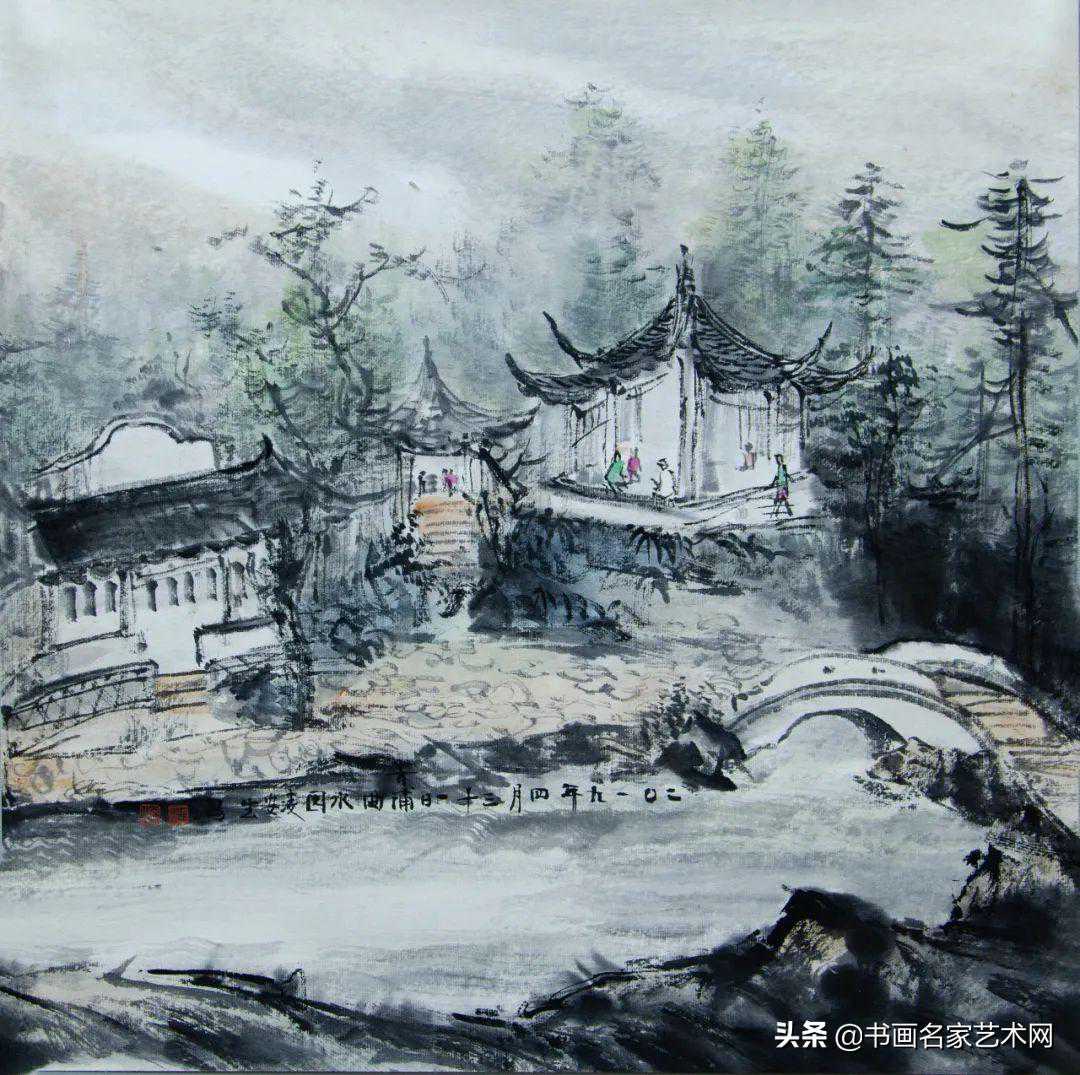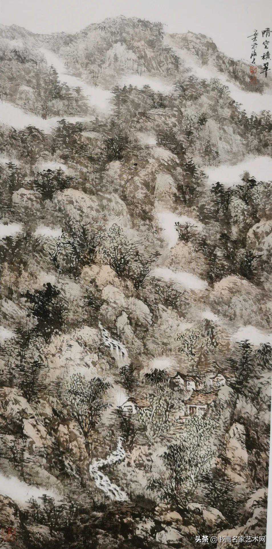 舟自横》,构图上虚下实,左右逢源,坡陀用泼墨法,墨沈淋漓,晕化多姿,树法笔致道凝、生辣,与墨法形成鲜明对比。江边泊舟虽寥寥数笔,却似整幅作品中的“画眼”,点醒画题,诗意盎然,读来意味隽永。青绿山水《青山不老》,赋彩明净,妍丽,山头、山脊留有光影效果,使叠嶂重峦更觉高耸,脉络相随,生机勃勃。《雁荡八折瀑》取细密、繁复一路,皴笔丰富,多遍积墨,点、线、面有序结合,黄鹤的松秀、苍润,龚贤的沉雄、墨亮凸现雁荡山岭起伏,丘壑纵横,林木葱郁,瀑水溅鸣,气象雄奇壮丽,令人眼前一亮。