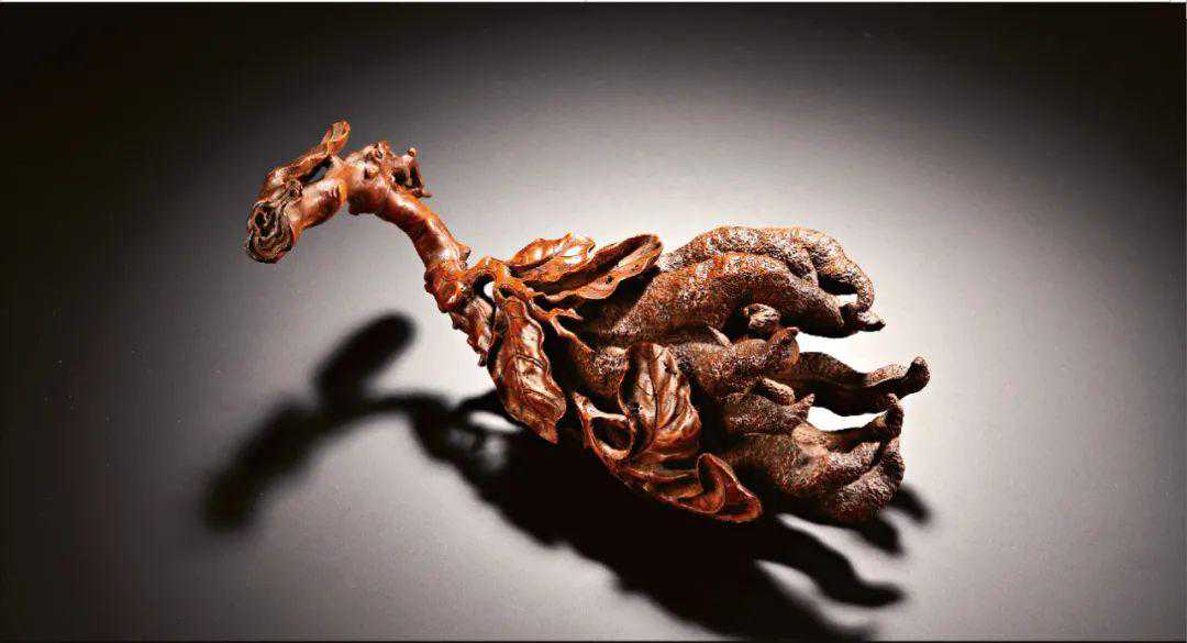 用竹刻作品来表现佛手在清代较常见,此件依照竹根天然形制,将光滑的细竹根与糙涩的粗竹根巧妙组合,运用圆雕、透雕等技艺,将果实及与之相连接的枝、叶、梗、蒂等琢刻得惟妙惟肖,佛手上棕点麻皮表现逼真,弯折掩映深浅多变,从不同角度观赏皆有不同效果,又辅以枝、叶等多重质感的差别对比,造型高度写实,其“仿生”惟妙惟肖,达到令人产生错觉的“乱真”效果,极具天然意趣。