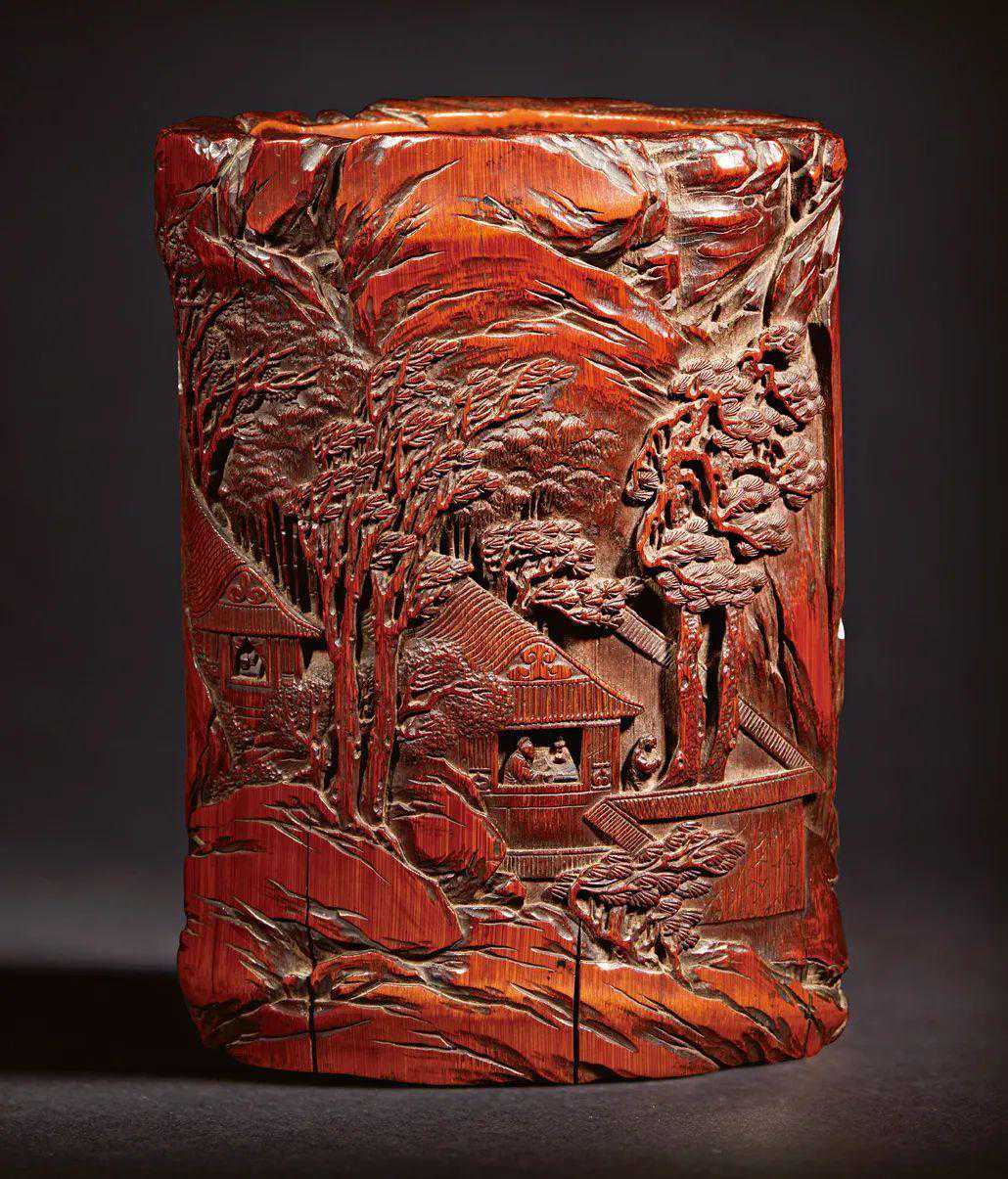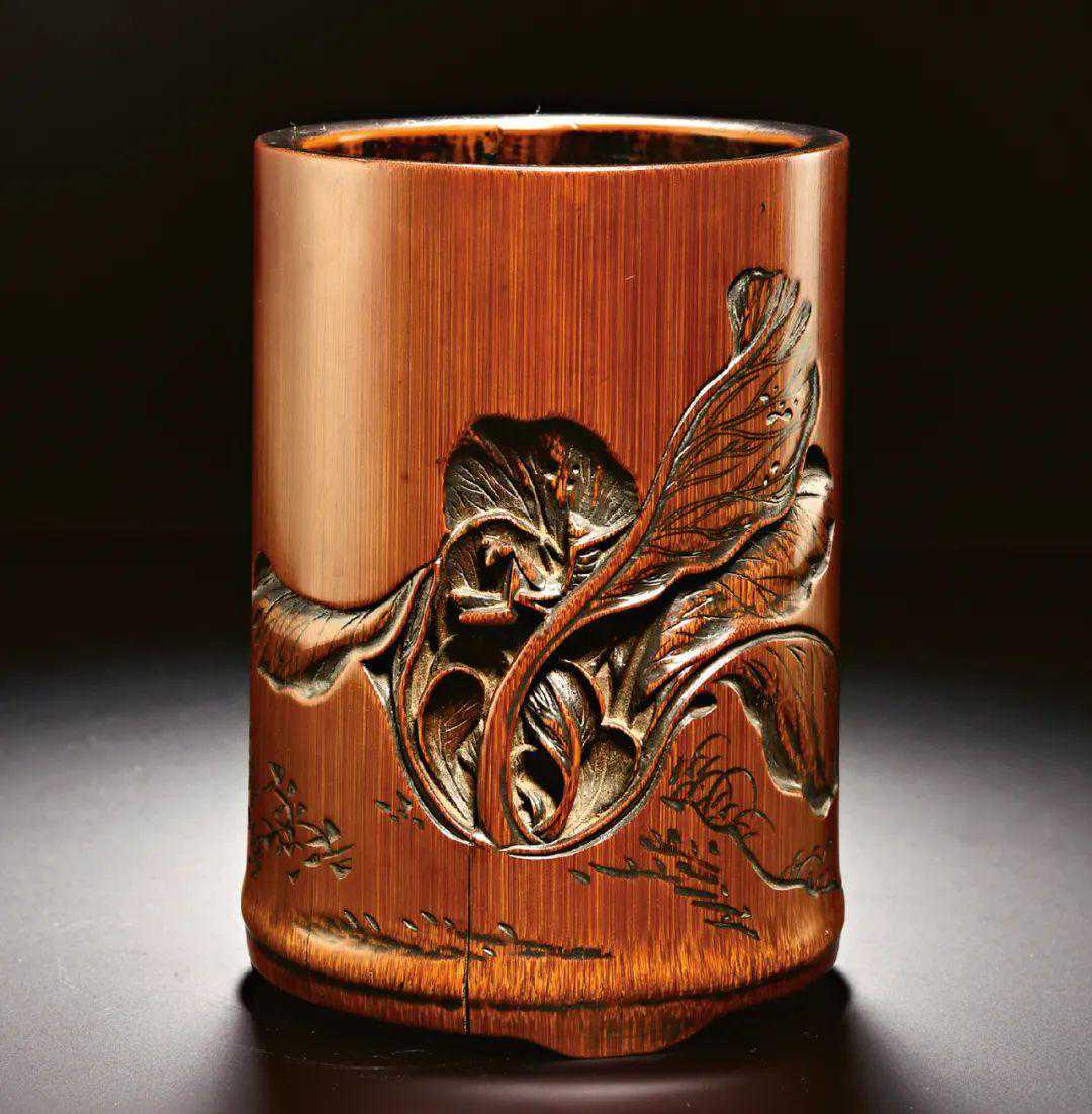 此作呈直筒状,三矮足,色如蒸栗,包浆温润。外壁一侧以陷地深刻法,雕刻大白菜一颗,有成熟之际菜叶肥厚柔软的质感。剔刻范围自边缘轮廓直至菜心,深达数层,近高浮雕,纹饰层次分明,玲珑剔透,集中体现了陷地深刻技法的“似阳实阴,阴中有阳”特殊装饰效果,意境清雅脱俗。