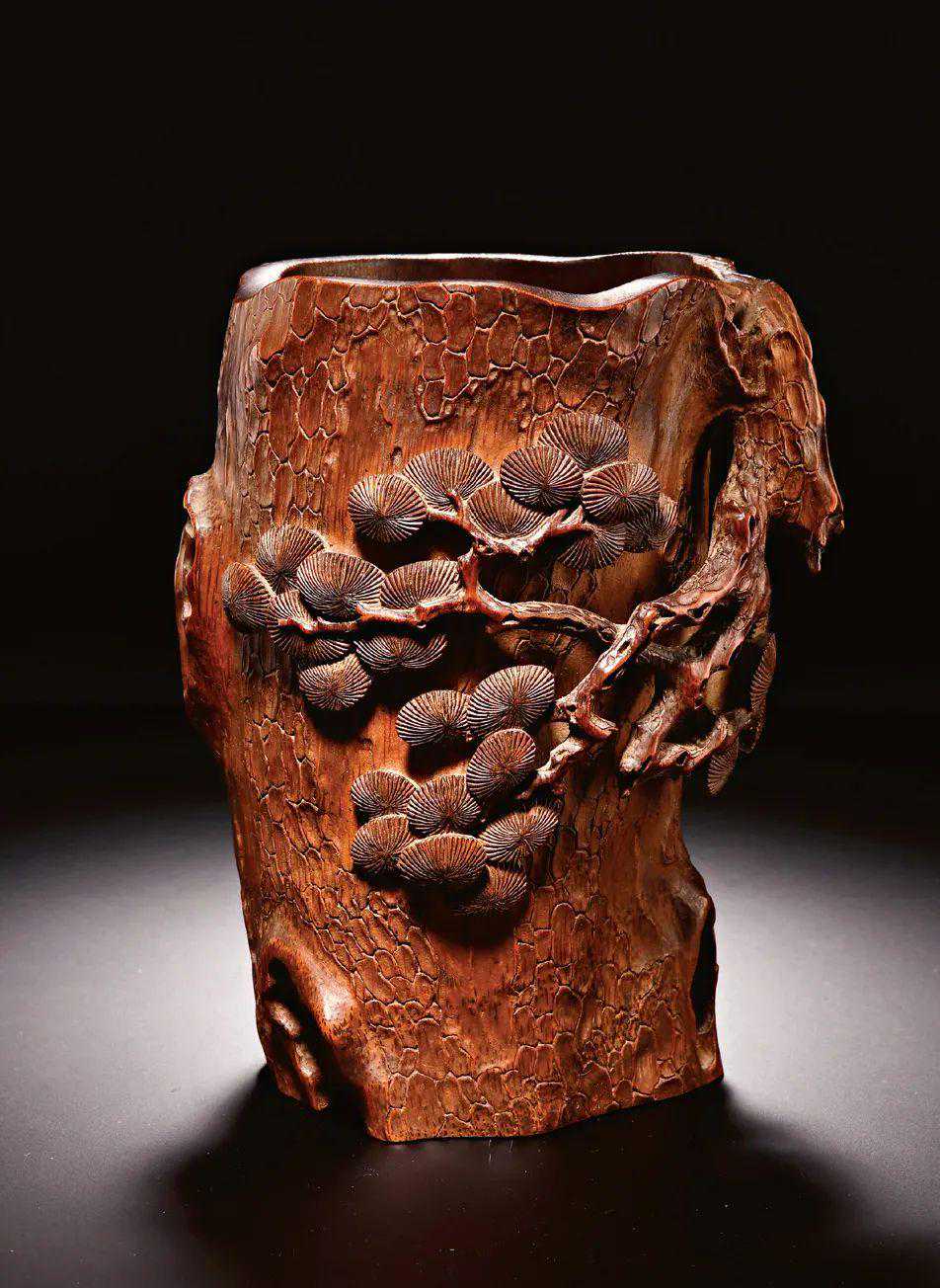 笔筒取竹根而成,雕老松巨干一截,密布鳞皴瘿节,其旁又出一松,虬枝纷卧,围抱巨干。器身采用深浮雕、浅浮雕、透雕等技法,刻出虬松巨桩之形。所刻苍松俨然千年物,松干遒劲,蟠曲如龙松鳞错落斑驳,宛若龙鳞。其上松针遍布枝头,硕大如轮,重重层层,如云如盖。尤引人注目者在于设计之精巧,松鳞、瘿节多假竹根瘢痕刻成,浑然一体,别具新意。