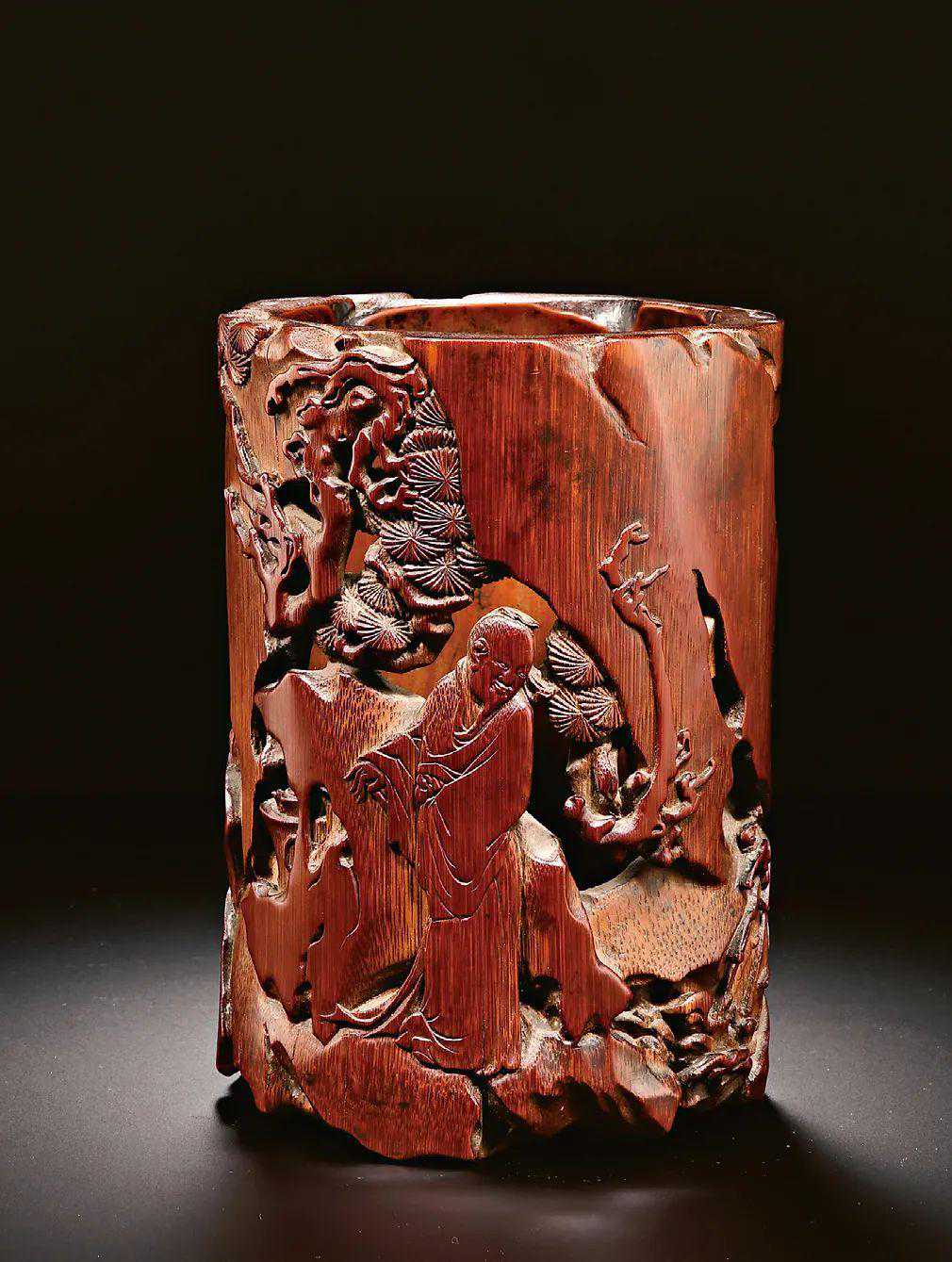 笔筒通景以深浮雕与透雕结合的技法雕刻松下高士听泉烹茶图。画面中高士拢发长髯,凤眼隆鼻,宽额丰颐,低头侧首,洒脱闲适,宽袖博带,衣纹清扬,褶皱自然。身后古松虬然,枝干似苍龙,针叶如车轮,身前山石嶙峋,怪瘦镂透。另侧两小童眉开眼笑,顽皮可爱,或手持如意,或精心研墨,桌上文玩清供罗列,风雅高洁。筒口、筒底不似通常之器打平磨光,亦随形浮雕刻画岩石松叶,简老朴茂,逸趣横生。