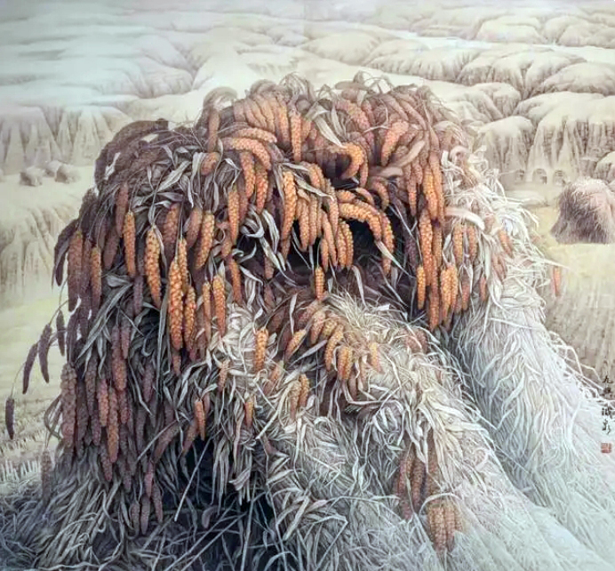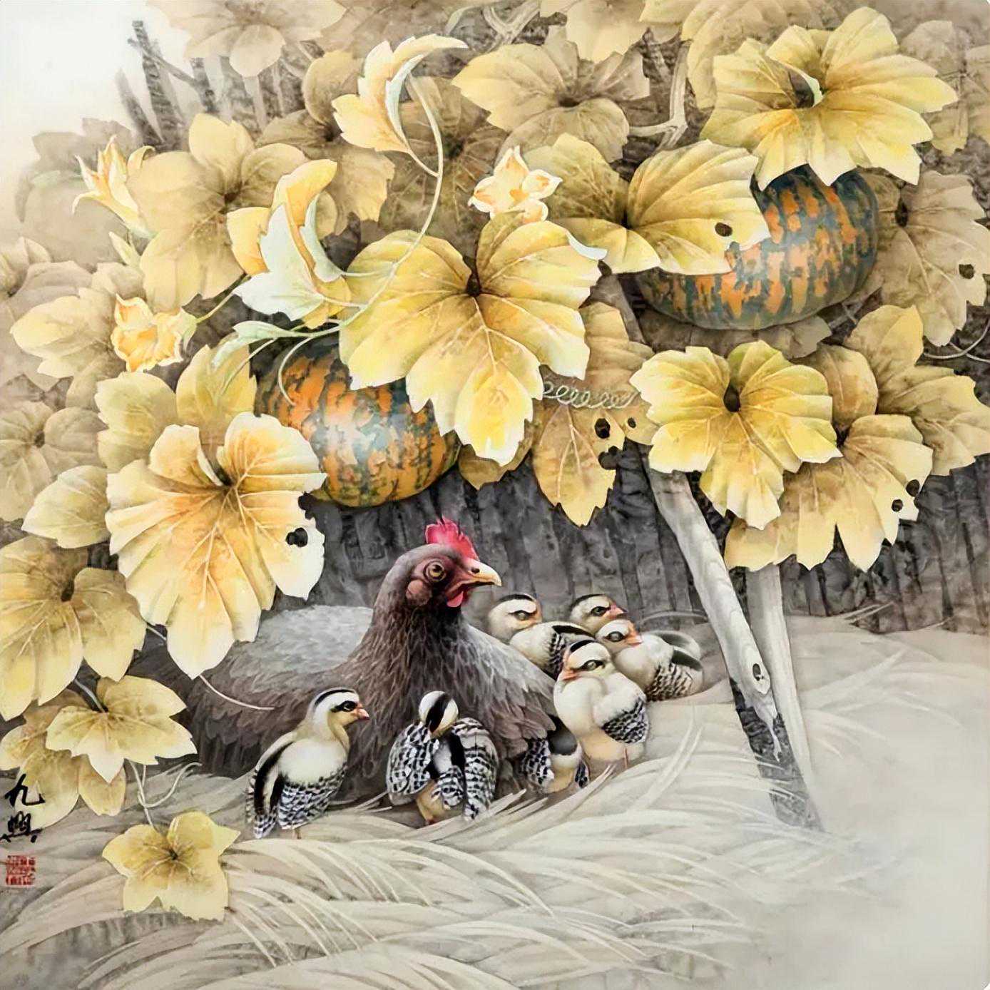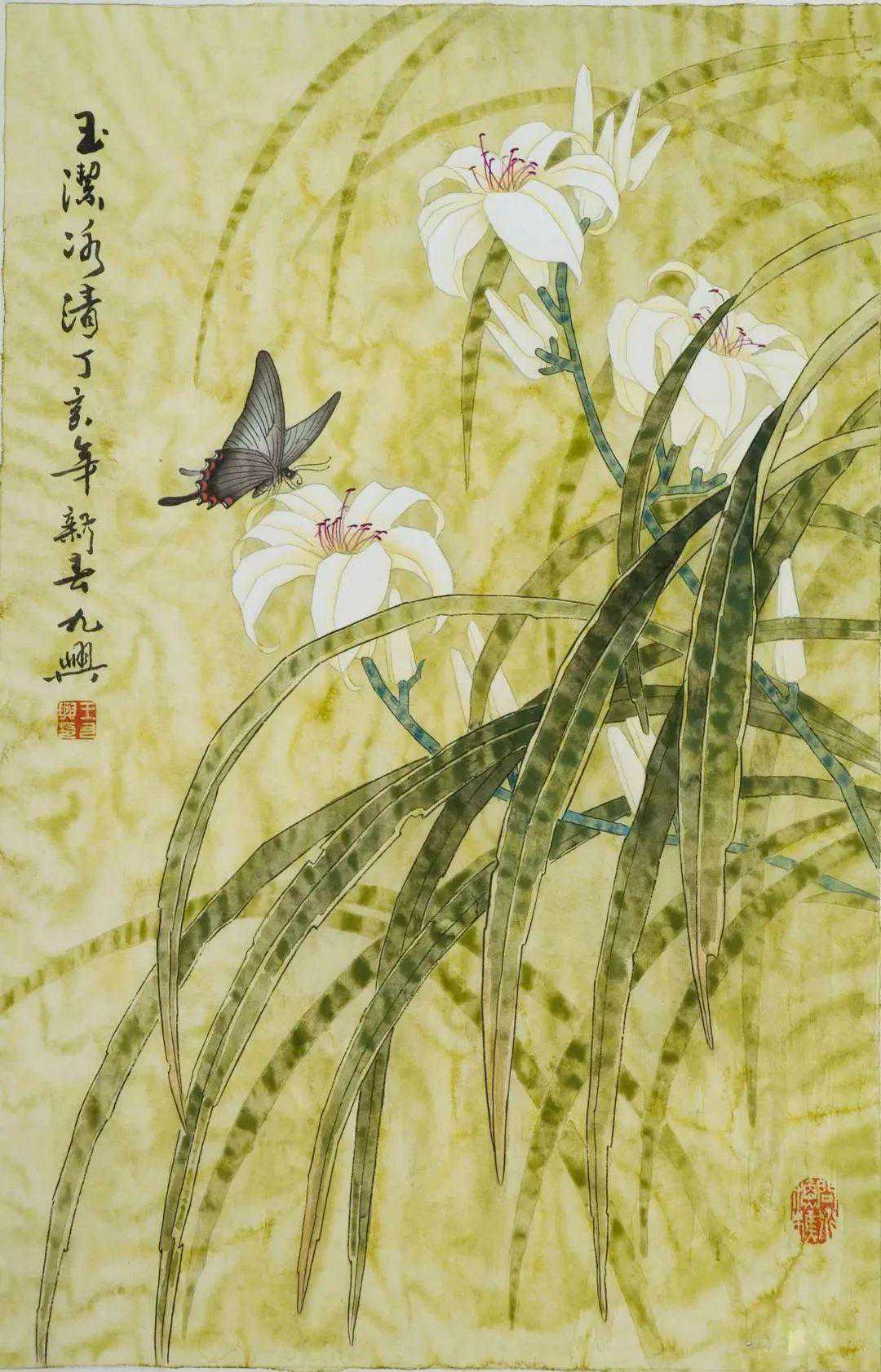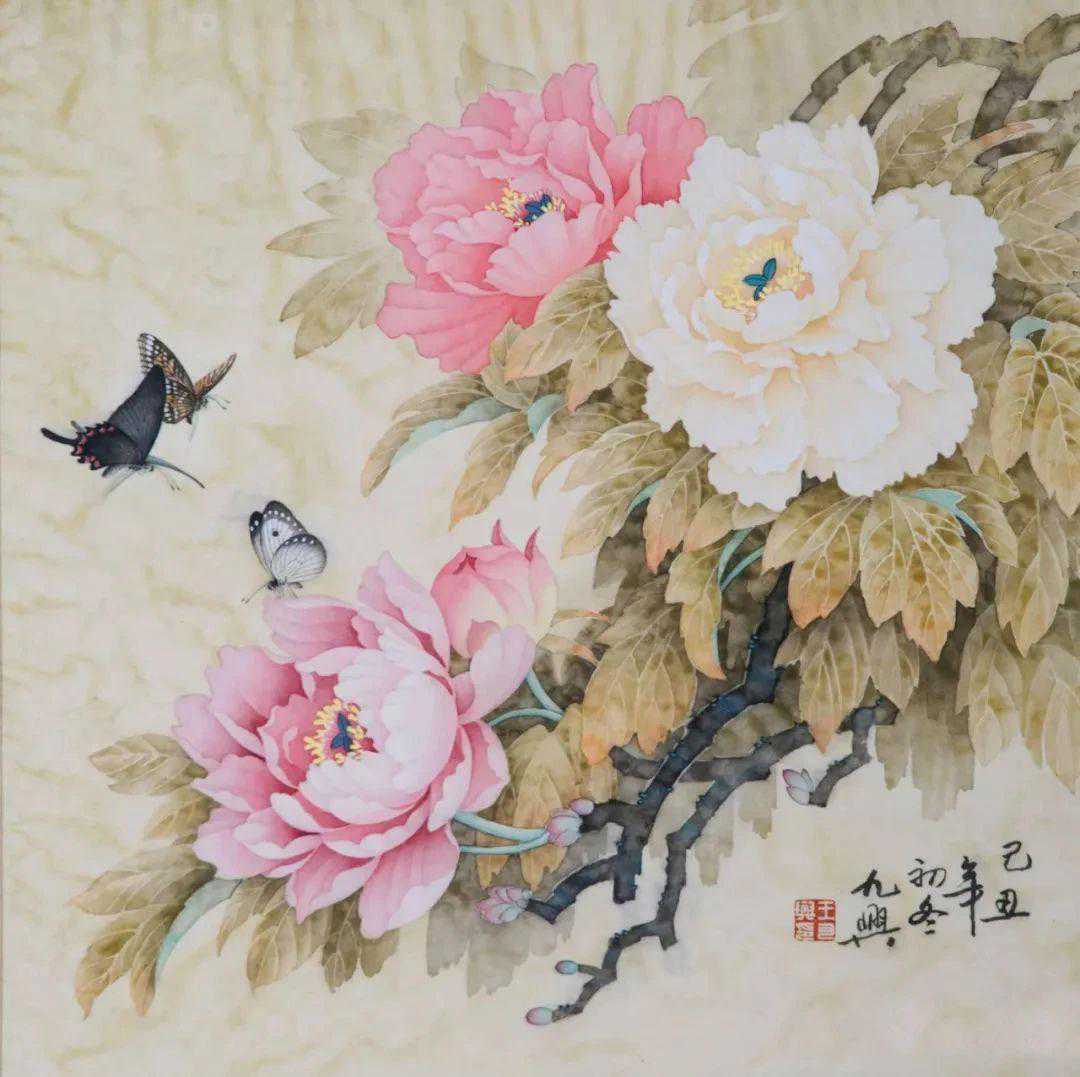王九兴:原名久兴,满族人,出生于1945年的辽宁省黑山县,1965年毕业于鲁迅美术学院。他是一位国家一级美术师(教授),同时也是中国美术家协会的会员,中国田园画会常务理事,以及许多其他艺术组织的成员。他曾任铁岭工笔画院的院长,现在是湖南省东方名人书画院的顾问。