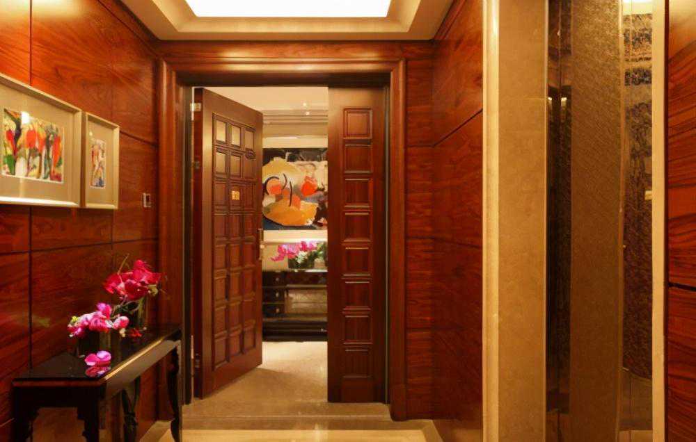 走进室内,玄关的设计同样让人眼前一亮。沉稳的木质装修与鲜花、艺术画的点缀相得益彰,既体现了主人的品味,又让整个空间充满了生机与活力。而深木色的家具与绿植、装饰画的碰撞,更是营造出一种沉稳而不失温柔的艺术氛围。