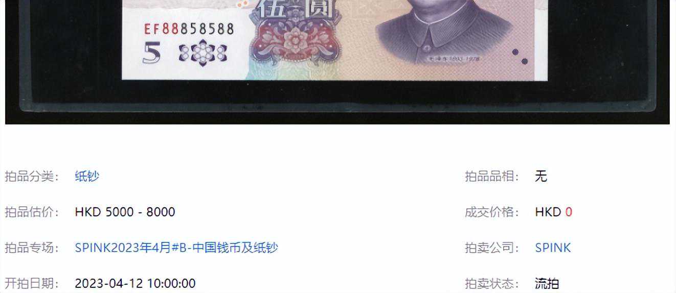 在今年,有一张新版5元纸币,出现在SPINK拍卖会上,它的估价高达8000。