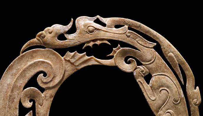 古人认为玉是上天恩赐的宝物,具有沟通天地鬼神的灵性。在中国传统文化理念中,玉璧象徵著美好的意愿和高贵的品质,其用途可作为祭器、礼器、珮饰等。玉璧在春秋战国时代,出现出廓的创新製作,即在内孔或外缘上镂雕出生动的动物形象。本件玉璧设计新颖奇特,刀工流畅,对称和谐,造型特殊,甚为难得。