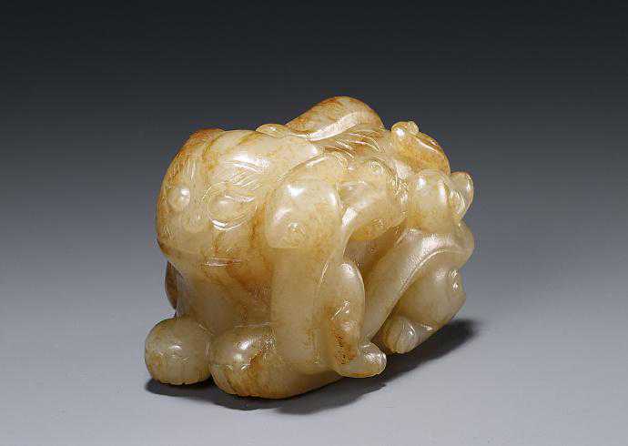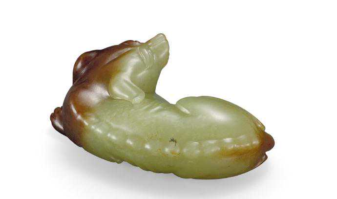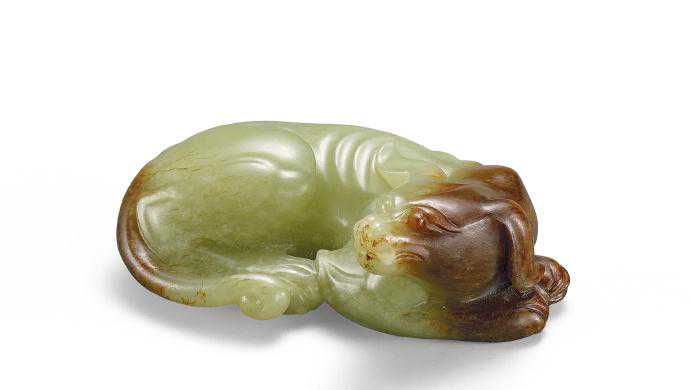 卧犬雕琢精细,写实生动,将其閒适自在的神情巧妙捕捉,神形兼备。诸如本件姿态闲静之肖生玉,在宋至清初颇为盛行,或为镇纸、或为清玩,极具意趣。「犬」的谐音为「全」,可取十全十美之意,同时也是忠诚的标志。然本件透过圆浑刀法与娴熟工艺,将卧犬生命力灵活呈现,为难得之佳作。