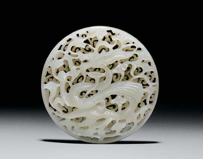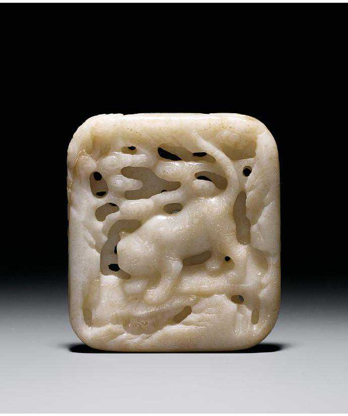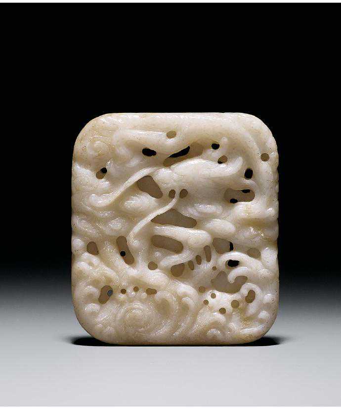 白玉质,选料饱满,质若凝脂,光华隐隐。牌呈扁平方形,四方倭角,採中堂镂空,两面均以镂刻及减地浮雕技法刻划「风云际会」为主题。一面饰苍龙腾云驾雾,龙身蜿蜒,遒躯蟠曲,于云中若隐若现,气势威仪,下方海水翻腾,惊滔骇浪映入眼前;另面猛虎雄踞岩石之上,四肢健壮,虎视眈眈,旁衬苍劲古松,怪岩重叠,烘托出双雄风云际会之壮绝气势。然龙吟云出,盪穀飘风,虎啸风生,双雄际会,可谓叱吒风云。