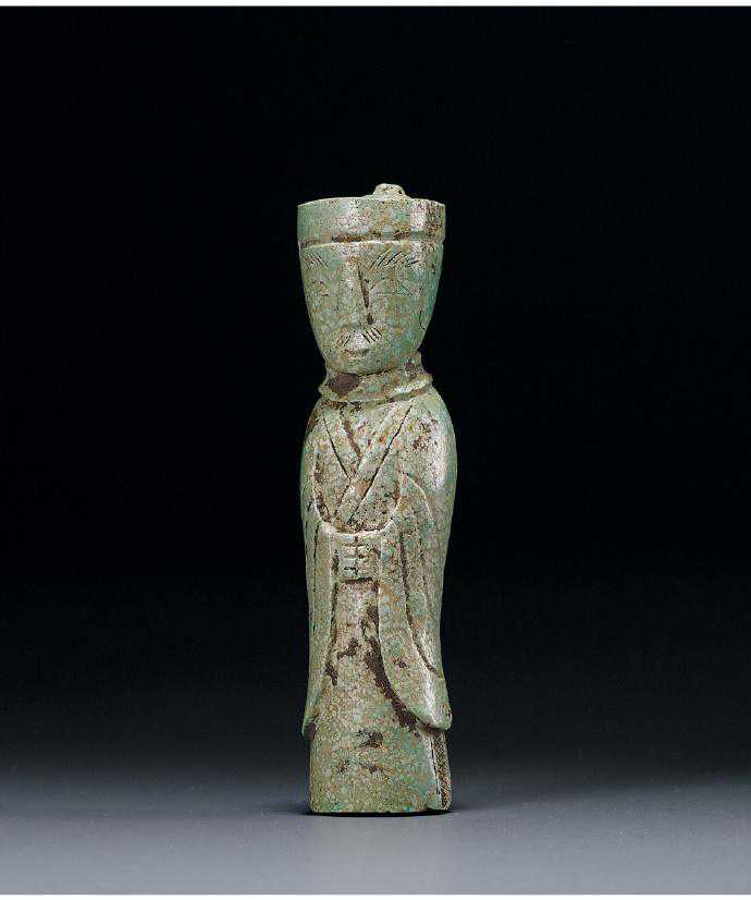 翁仲以绿松石圆雕而成,呈站立状,中年男性形象,大鼻小口,以阴线刻划眉眼、双耳及头髮、鬍鬚,脑后髮丝排列整齐,向上梳起挽成髻。头戴平冠,顶凸起一小孔,可供繫挂。身穿长袖衣,衣领右衽,宽衣博袖,腰繫宽带,双手交握至于腹前,长裙曳地,由服饰特徵可辨认为汉服,实为难得之精緻佳品。