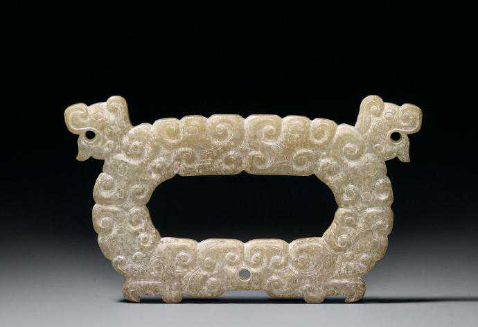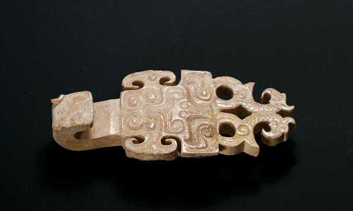 玉料受天然钙化,呈白褐色沁,色泽朴实沉稳。钩首雕为龙首形,双耳凸起,阴线刻划菱形双目及格状纹路,钩首背面细线刻勾云纹饰髮丝。钩身镂雕双凤与鈎首相背,凤首头羽上勾,尖喙下弯,下承中空环形,双环与钩首之间呈宽牌形,面作隐起兽面纹饰。