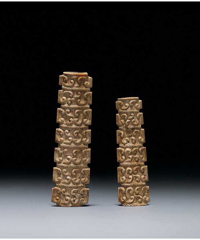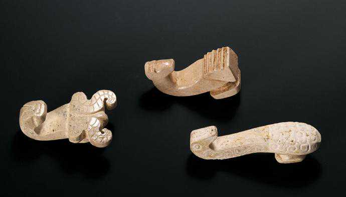 玉带钩三件一组,皆有白化自然沁色,呈不透明,黄褐钙化色沁及半透明,满布如鸡骨白色之灰沁。带钩由钩首、钩身和钩钮三部分组成,皆为龙首,背设方形钮或圆形钮,身雕琢为不同造型,两侧边沿切削成微斜坡度,既对称得体又平整美观。一钩身长条略呈琵琶形,满饰连云纹,龙首素面微上翘;一钩较短,身上饰数道平行凸棱,钩首简易抽象,隐约可见龙首状;另一带钩为宽牌形,面饰两相背蟠螭纹,曲折呈S形,阴线琢圆形双眼,身躯刻格状纹,钩首面刻阴线纹饰,造型奇巧少见。整组带钩琢磨细腻,造型简洁特殊,刀工简约大器,线条挺劲流畅,充满古朴韵味,尽显独特艺术神韵。