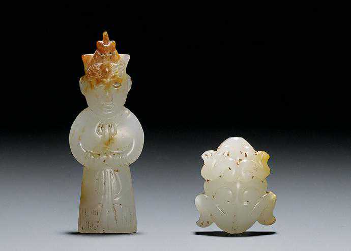 玉人、玉蛙二件一组,白玉质,温润透亮,局部带褐色沁。玉人呈立姿状,头戴高冠,髮型由前向后梳齐,脑后结髮辫上挽,包入冠内。脸部五官清秀,穿窄袖长袍,拱手直立,衣领、下摆饰斜线纹,气质高雅怡然。战国时期玉人多为现实生活中之形象,如今北京故宫博物院庋藏战国〈玉人〉,其顶上冠饰造型与本件白玉人相近,髮丝、衣领及下摆刻划细丝纹,展现战国服饰的华丽及工艺,可做为战国时期社会生活及服饰的研究。
