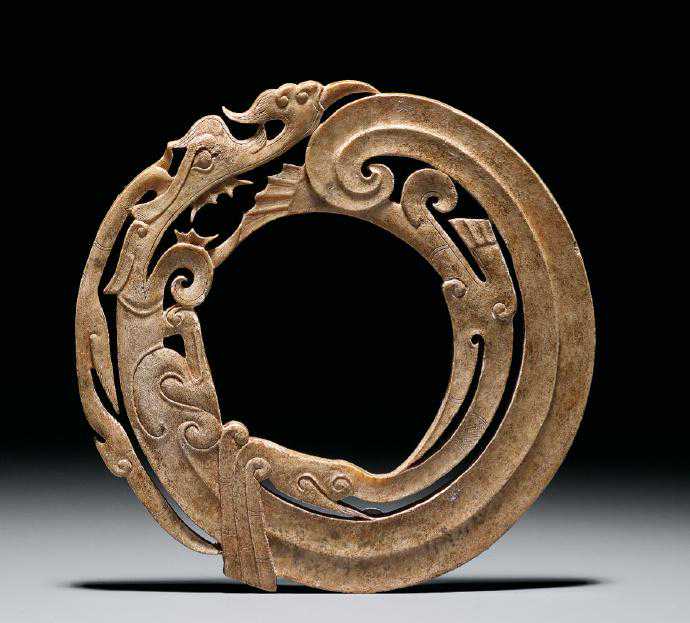黄褐色质,色泽古朴,因受沁表面带有土黄色及灰白色沁斑,沁色自然华美。珮呈扁平圆环体,双面纹饰相同,以镂雕及压地隐起技法雕琢而成。龙首衔其尾弯曲呈环形,吻部前突,捲鼻,龙口大张,露尖利獠牙,上下唇前捲后翻。龙身鳞羽以抽象化处理,饰似竹节及卷云组合纹饰,足部肌肉突起,显得分外活泼挺劲。整器造型纹样规整,线条严谨有序,蜷曲成环的造型设计奇特,镂空技术娴熟,表现出高超的审美情趣,是件艺术造诣极高的汉代玉器佳品。