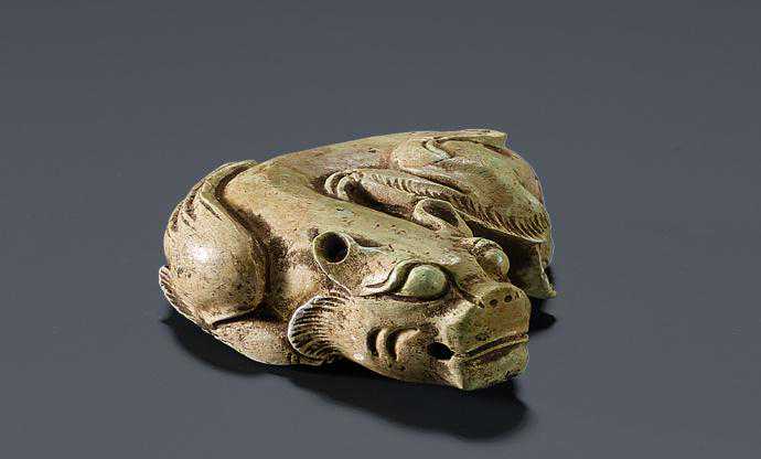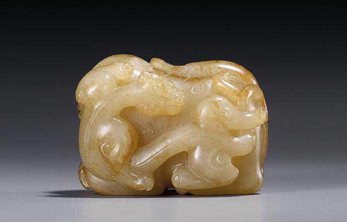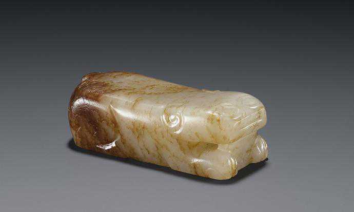 虎为百兽之君,自古以来受到中国人崇拜,更是正义、勇猛与威严的象徵。龙为中华民族图腾,传说能隐能显,春风时登天,秋风时潜渊,又能兴云致雨、腾云驾雾。又《周易.乾.文言》:「云从龙,风从虎,圣人作万物睹。」龙与虎相聚乃「风云际会」祥瑞之象,以比喻有才华、有作为之人在难得时机相聚一起。本器巧取玉之皮沁,刀法简明生动,通过精湛的雕工与合理布局,形神兼备将风云际会完美呈现,可置于文房中作为纸镇或玩赏之用。