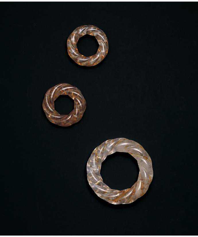 环三件一组,以水晶为材琢磨而成,两件较小之绳纹环近褐色,最大者透明清亮,局部带黄色斑。环呈圆形体,如绞拧绳索,线条规整,抛光精緻。整组水晶环雕琢精细,绳索纹样分明,可见雕琢技艺之精湛。本组水晶绳纹环通透温润,雕工之巧为后世工匠望尘莫及,令人讚叹,整体保存完好,实为难得一见之精品。